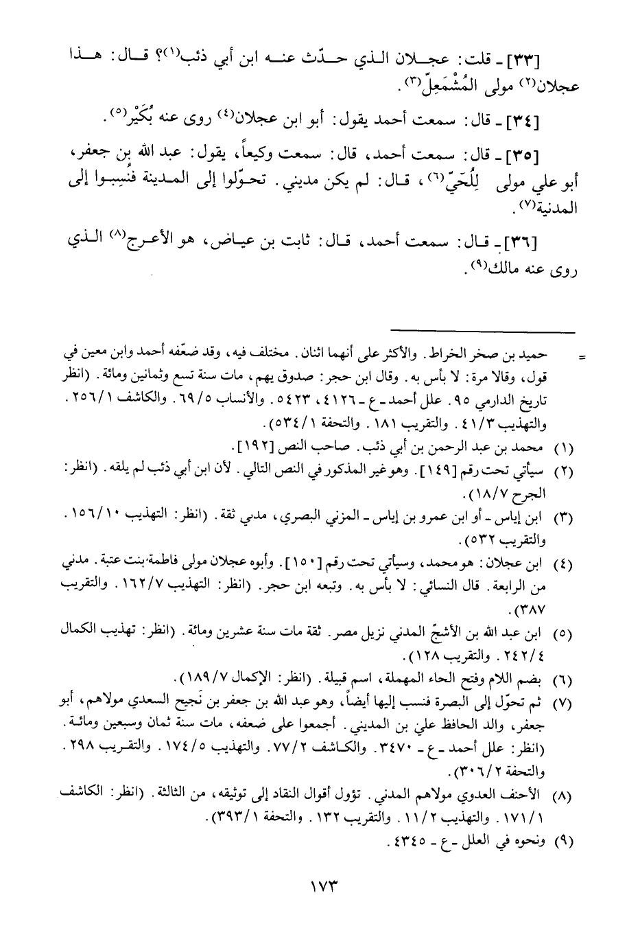 [33] قلت عجلَان الَّذِي حدث عَنهُ ابْن أبي ذِئْب قَالَ هَذَا عجلَان مولى المشمعل