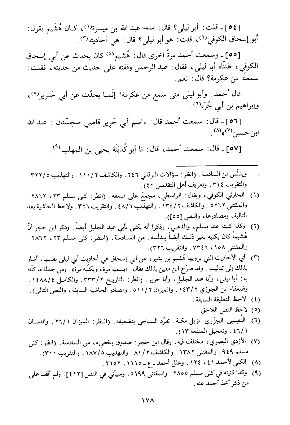 [54] قلت أَبُو ليلى قَالَ اسْمه عبد الله بن ميسرَة كَانَ هشيم يَقُول أَبُو إِسْحَاق الْكُوفِي قلت هُوَ أَبُو ليلى قَالَ هِيَ أَحَادِيثه