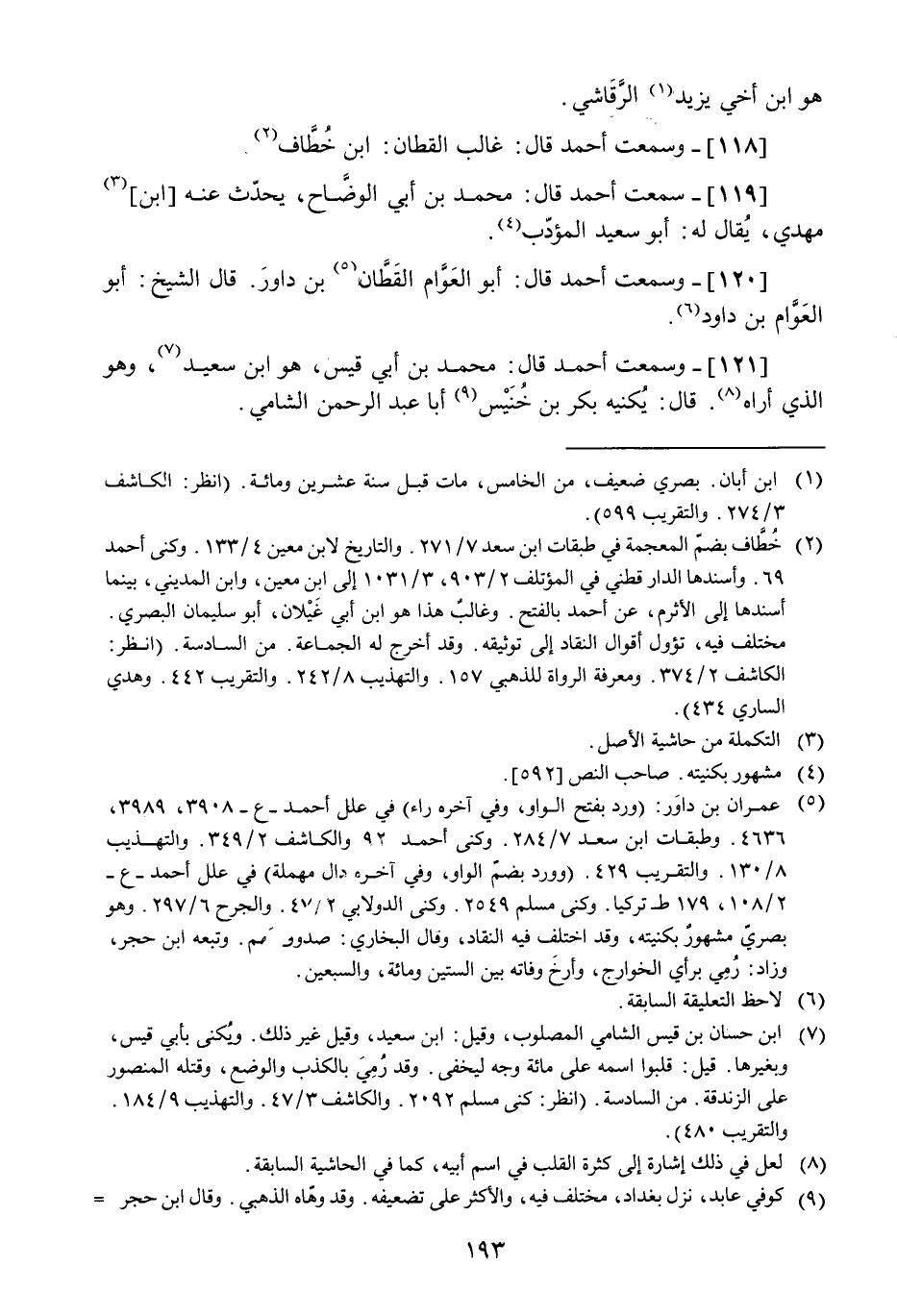 [121] وَسمعت أَحْمد قَالَ مُحَمَّد بن أبي قيس هُوَ ابْن سعيد وَهُوَ الَّذِي أرَاهُ قَالَ يكنيه بكر بن خُنَيْس أَبَا عبد الرَّحْمَن الشَّامي