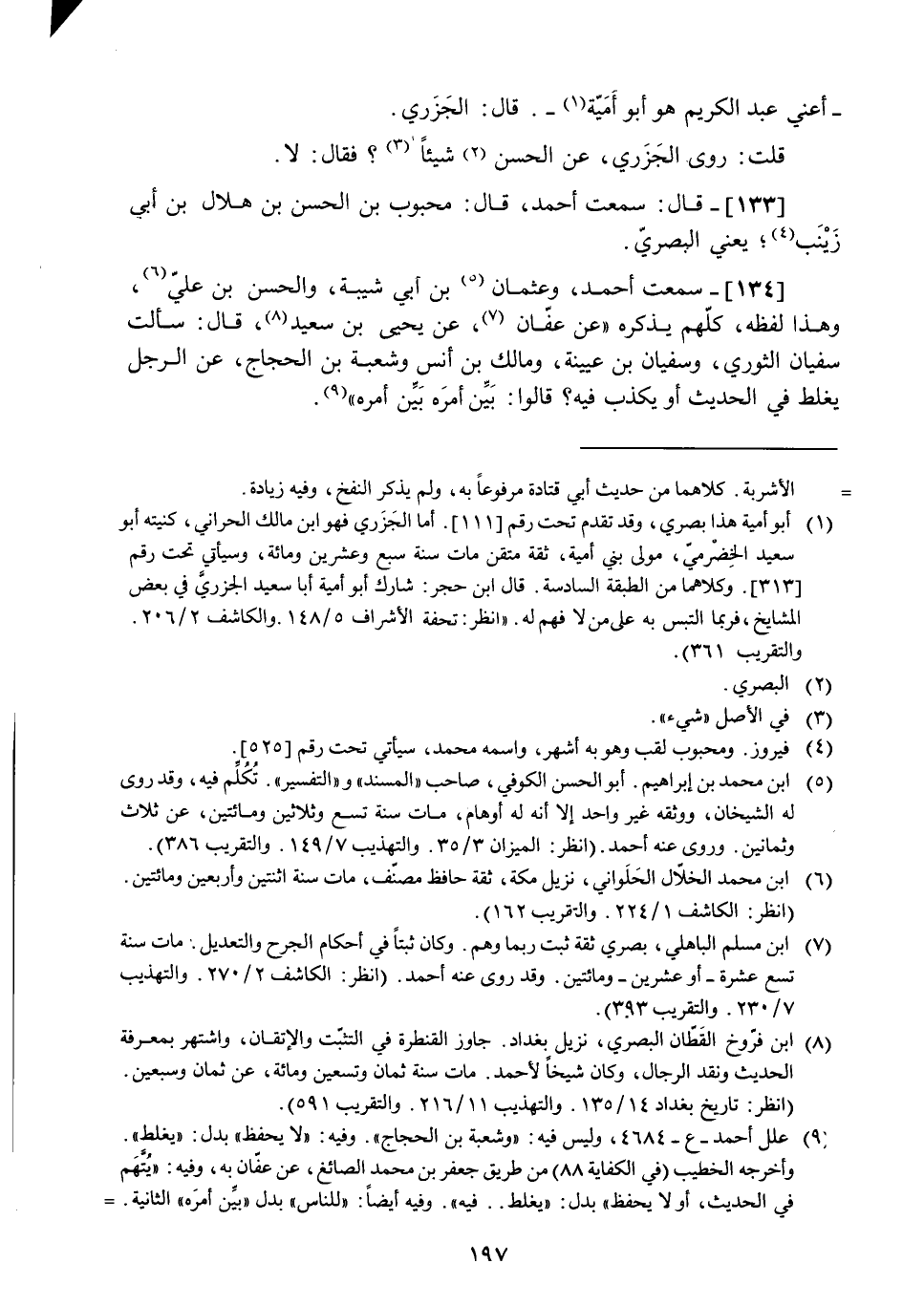 [134] سَمِعت أَحْمد وَعُثْمَان بن أبي شيبَة وَالْحسن بن عَليّ وَهَذَا لَفظه كلهم يذكرهُ عَن عَفَّان عَن يحيى بن سعيد قَالَ سَأَلت سُفْيَان الثَّوْريّ وسُفْيَان بن عُيَيْنَة وَمَالك بن أنس وَشعْبَة بن الْحجَّاج عَن الرجل يغلط فِي الحَدِيث أَو يكذب فِيهِ قَالُوا بَين أمره بَين أمره