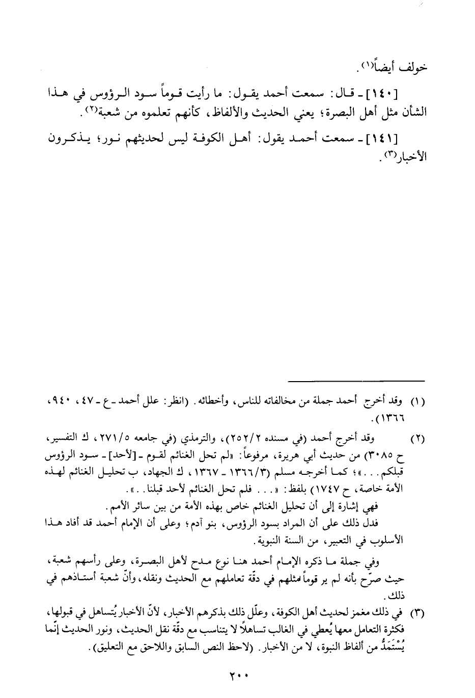[140] قَالَ سَمِعت أَحْمد يَقُول مَا رَأَيْت قوما سود الرؤوس فِي هَذَا الشَّأْن مثل أهل الْبَصْرَة يَعْنِي الحَدِيث والألفاظ كَأَنَّهُمْ تعلموه من شُعْبَة