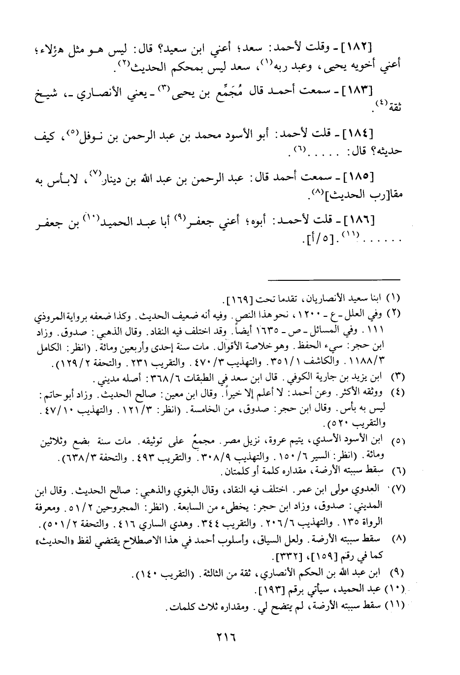 [182] وَقلت لِأَحْمَد سعد أَعنِي ابْن سعيد قَالَ لَيْسَ هُوَ مثل هَؤُلَاءِ أَعنِي أَخَوَيْهِ يحيى وَعبد ربه سعد لَيْسَ بمحكم الحَدِيث