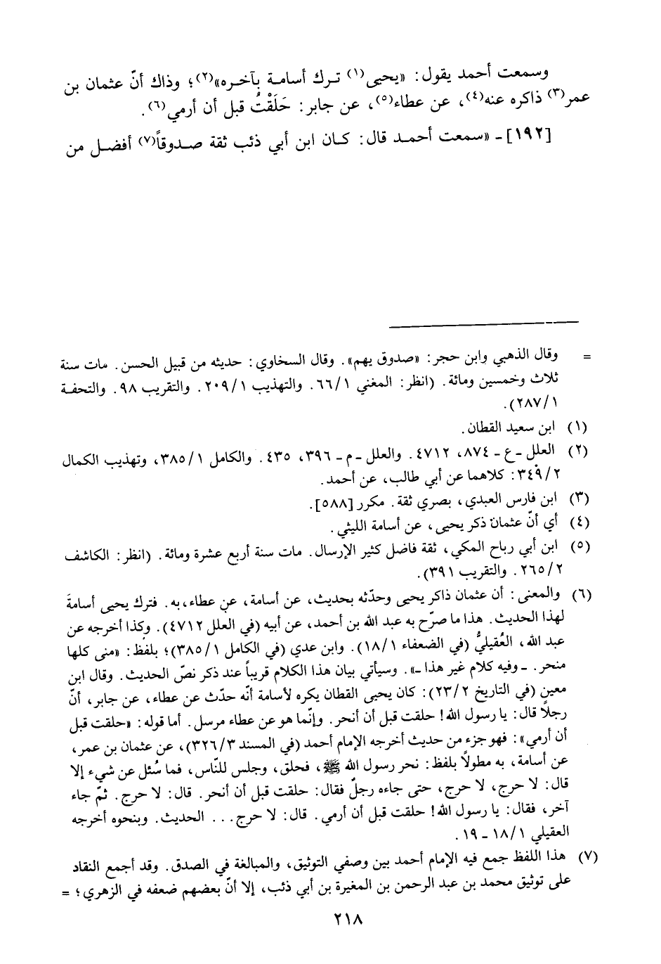 وَسمعت أَحْمد يَقُول يحيى ترك أُسَامَة بِآخِرهِ وَذَاكَ أَن عُثْمَان بن عمر ذاكره عَنهُ عَن عَطاء عَن جَابر حلقت قبل أَن أرمي