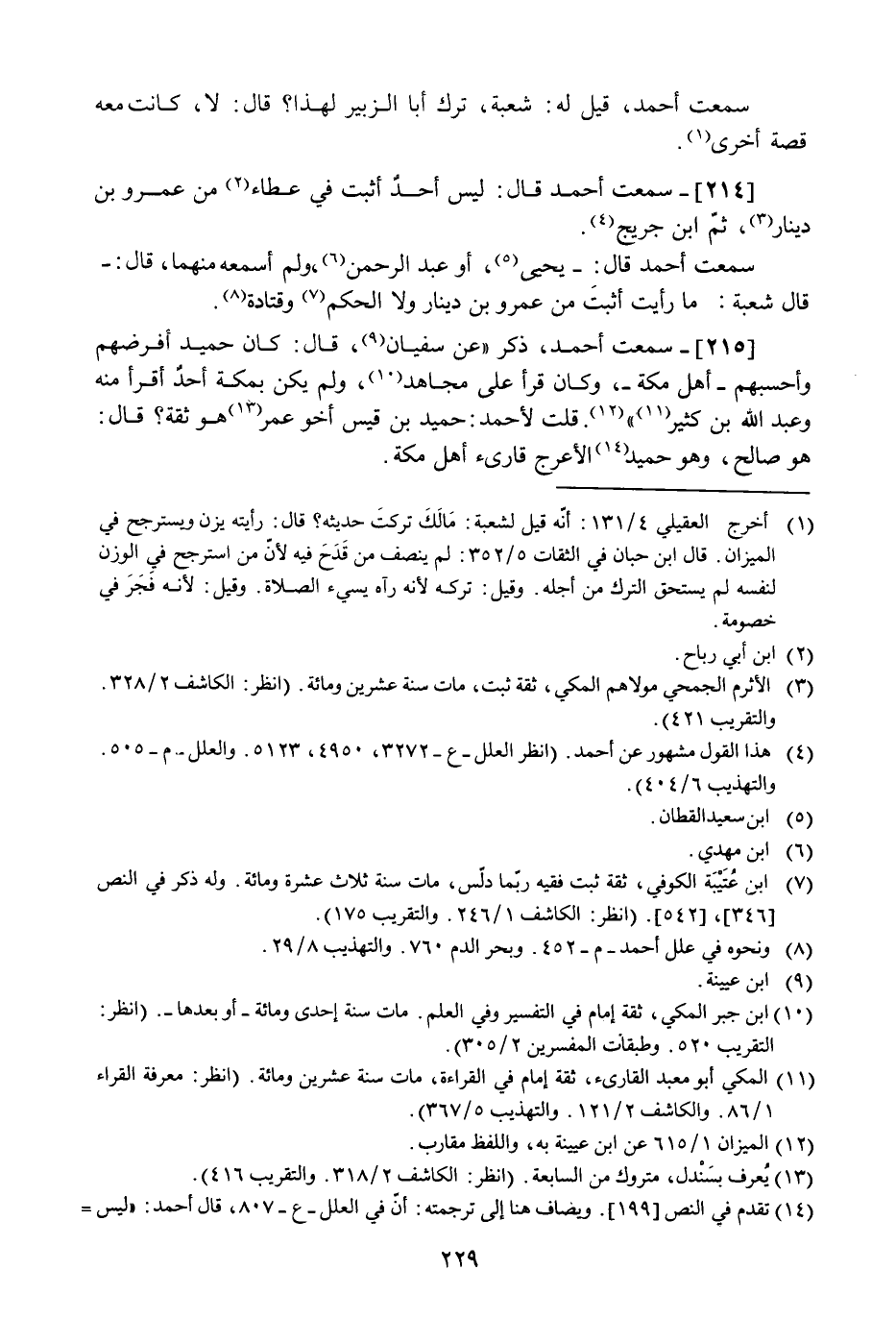 [215] سَمِعت أَحْمد ذكر عَن سُفْيَان قَالَ كَانَ حميد أفرضهم وأحسبهم أهل مَكَّة وَكَانَ قَرَأَ على مُجَاهِد وَلم يكن بِمَكَّة أحد أَقرَأ مِنْهُ وَعبد الله بن كثير قلت لِأَحْمَد حميد بن قيس أَخُو عمر هُوَ ثِقَة قَالَ هُوَ صَالح وَهُوَ حميد الْأَعْرَج قارىء أهل مَكَّة