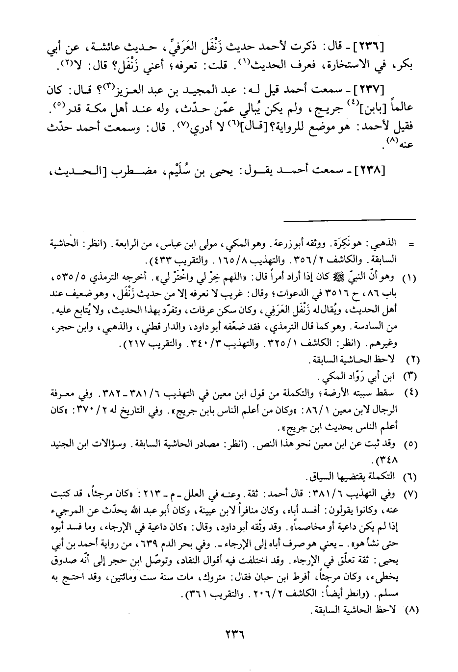 [236] قَالَ ذكرت لِأَحْمَد حَدِيث زنفل الْعرفِيّ حَدِيث عَائِشَة عَن أبي بكر فِي الاستخارة فَعرف الحَدِيث قلت تعرفه أَعنِي زنفل قَالَ لَا