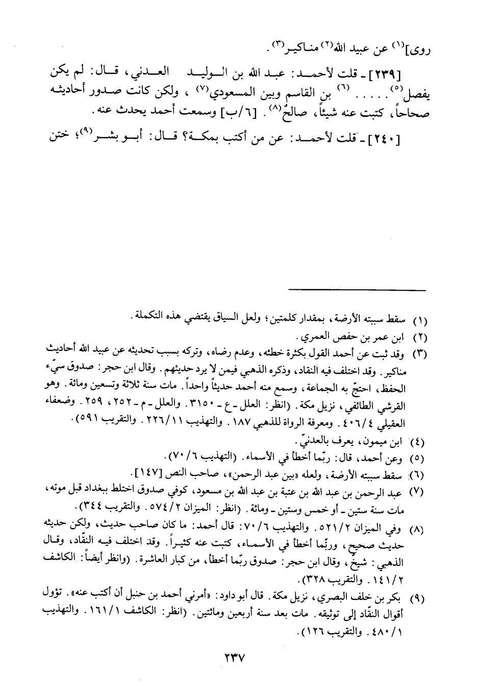 [239] قلت لِأَحْمَد عبد الله بن الْوَلِيد الْعَدنِي قَالَ لم يكن يفصل بن الْقَاسِم وَبَين المَسْعُودِيّ وَلَكِن كَانَت صُدُور أَحَادِيثه صحاحا كتبت عَنهُ شَيْئا صَالح [6 ب] وَسمعت أَحْمد يحدث عَنهُ