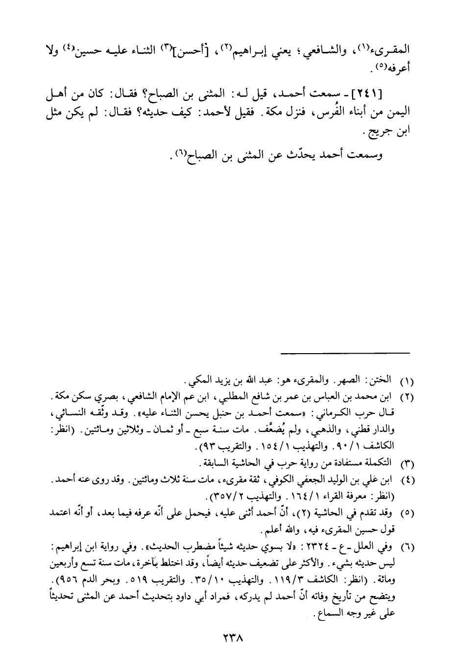 [241] سَمِعت أَحْمد قيل لَهُ الْمثنى بن الصَّباح فَقَالَ كَانَ من أهل الْيمن من أَبنَاء الْفرس فَنزل مَكَّة فَقيل لِأَحْمَد كَيفَ حَدِيثه فَقَالَ لم يكن مثل ابْن جرجي