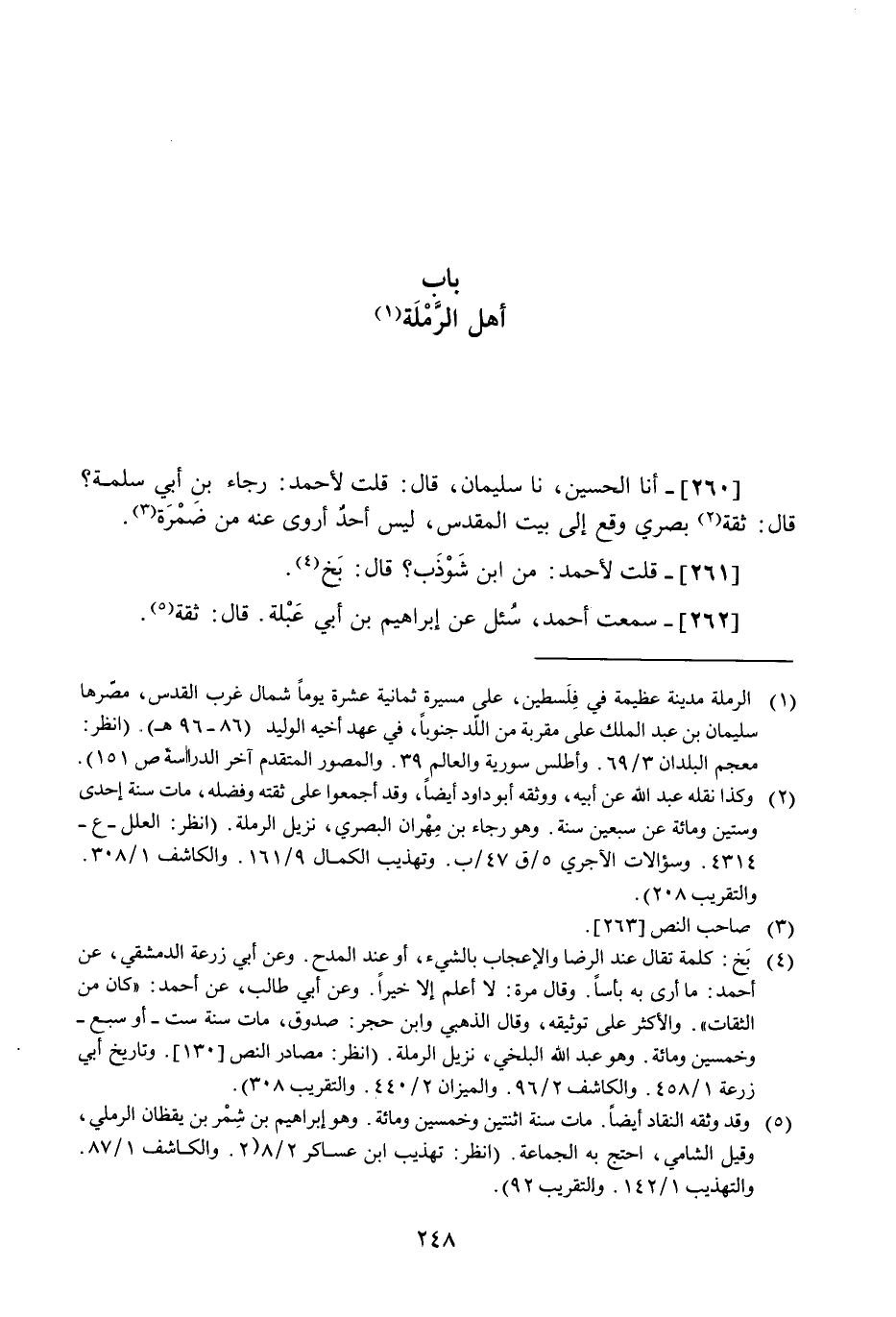 [260] أَنا الْحُسَيْن نَا سُلَيْمَان قَالَ قلت لِأَحْمَد رَجَاء بن أبي سَلمَة قَالَ ثِقَة بَصرِي وَقع إِلَى بَيت الْمُقَدّس لَيْسَ أحد أروى عَنهُ من ضَمرَة