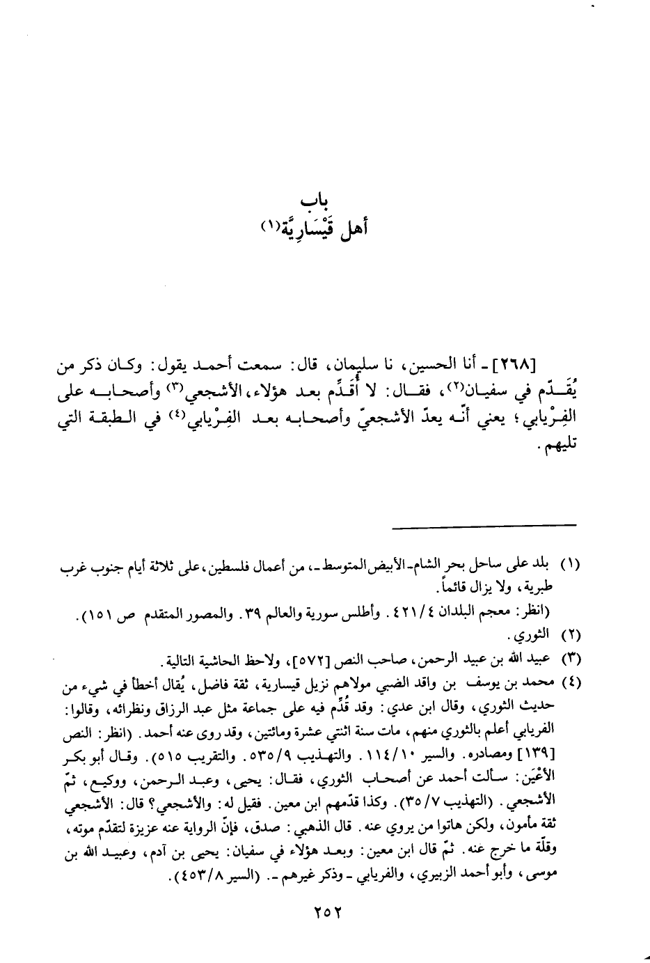 [268] أَنا الْحُسَيْن نَا سُلَيْمَان قَالَ سَمِعت أَحْمد يَقُول وَكَانَ ذكر من يقدم فِي سُفْيَان فَقَالَ لَا أقدم بعد هَؤُلَاءِ الْأَشْجَعِيّ وَأَصْحَابه على الْفرْيَابِيّ يَعْنِي أَنه يعد الْأَشْجَعِيّ وَأَصْحَابه بعد الْفرْيَابِيّ فِي الطَّبَقَة الَّتِي تليهم