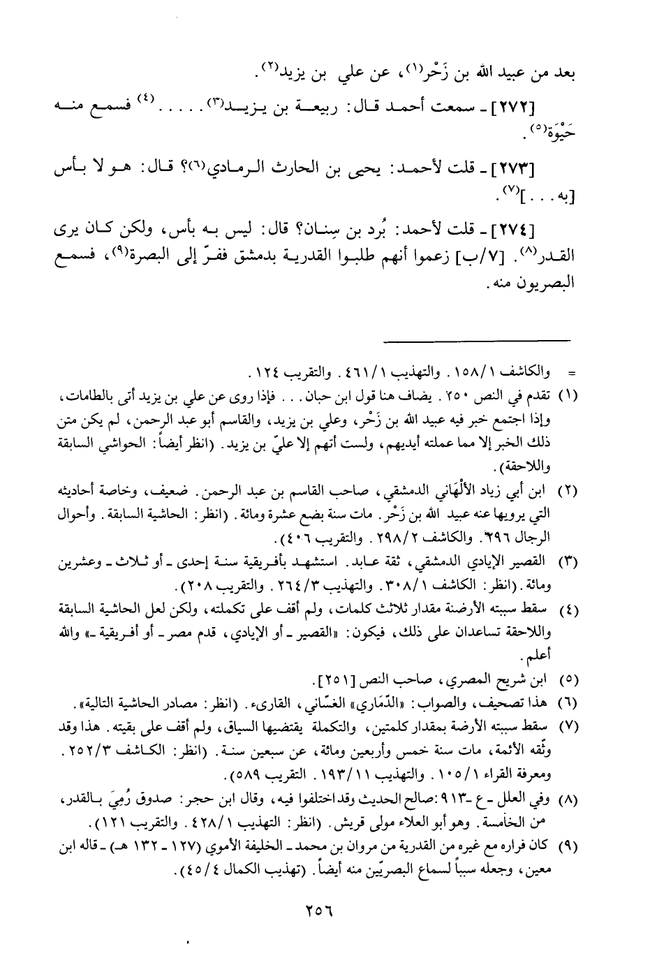 [274] قلت لِأَحْمَد برد بن سِنَان قَالَ لَيْسَ بِهِ بَأْس وَلَكِن كَانَ يرى الْقدر [7 ب] زَعَمُوا أَنهم طلبُوا الْقَدَرِيَّة بِدِمَشْق ففر إِلَى الْبَصْرَة فَسمع البصريون مِنْهُ