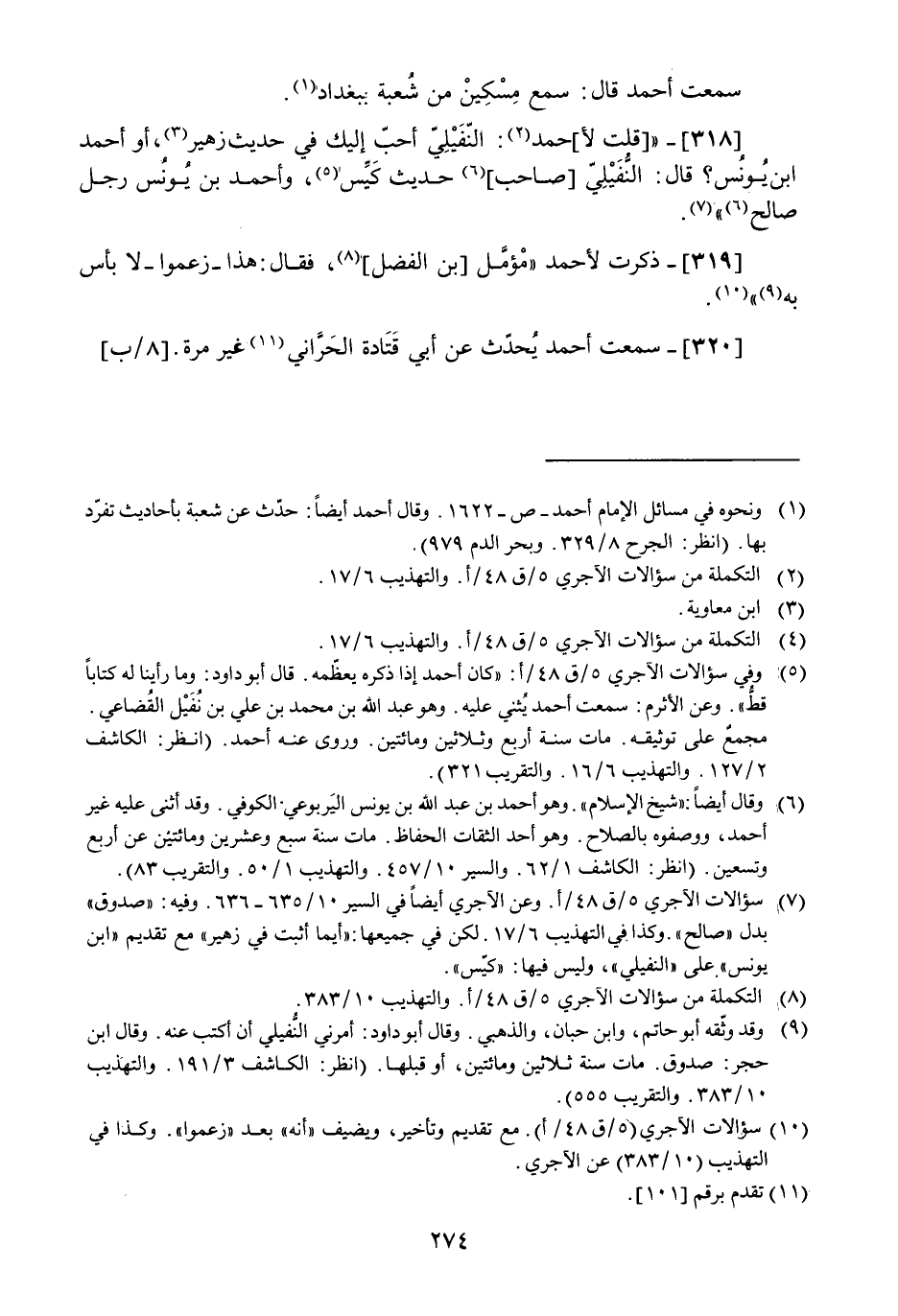 [318] [قلت لأ] حمد النُّفَيْلِي أحب إِلَيْك فِي حَدِيث زُهَيْر أَو أَحْمد ابْن يُونُس قَالَ النُّفَيْلِي [صَاحب] حَدِيث كيس وَأحمد بن يُونُس رجل صَالح