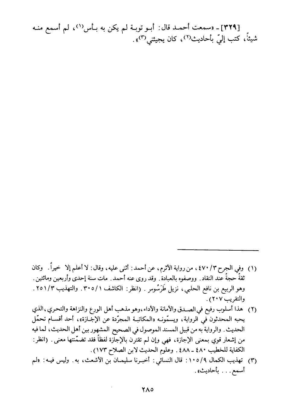 [329] سَمِعت أَحْمد قَالَ أَبُو تَوْبَة لم يكن بِهِ بَأْس لم أسمع مِنْهُ شَيْئا كتب الي بِأَحَادِيث كَانَ يجيئني