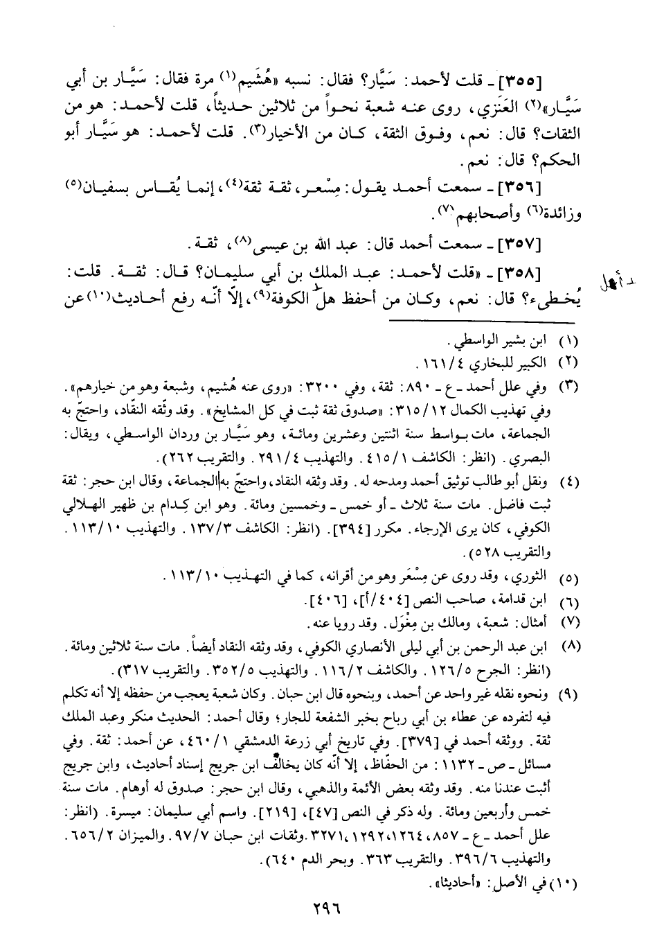 [355] قلت لِأَحْمَد سيار فَقَالَ نسبه هشيم مرّة فَقَالَ سيار بن أبي سيار الْعَنزي روى عَنهُ شُعْبَة نَحوا من ثَلَاثِينَ حَدِيثا قلت لِأَحْمَد هُوَ من الثِّقَات قَالَ نعم وَفَوق الثِّقَة كَانَ من الأخيار قلت لِأَحْمَد هُوَ سيار أَبُو الحكم قَالَ نعم