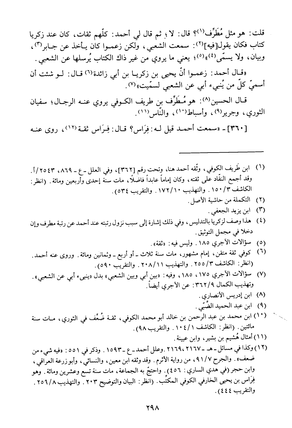 قلت هُوَ مثل مطرف قَالَ لَا ثمَّ قَالَ لي أَحْمد كلهم ثِقَات كَانَ عِنْد زَكَرِيَّا كتاب فَكَانَ يَقُول [فِيهِ] سَمِعت الشّعبِيّ وَلَكِن زَعَمُوا كَانَ يَأْخُذ عَن جَابر وَبَيَان وَلَا يُسمى يَعْنِي مَا يروي من غير ذَاك الْكتاب يرسلها عَن الشّعبِيّ