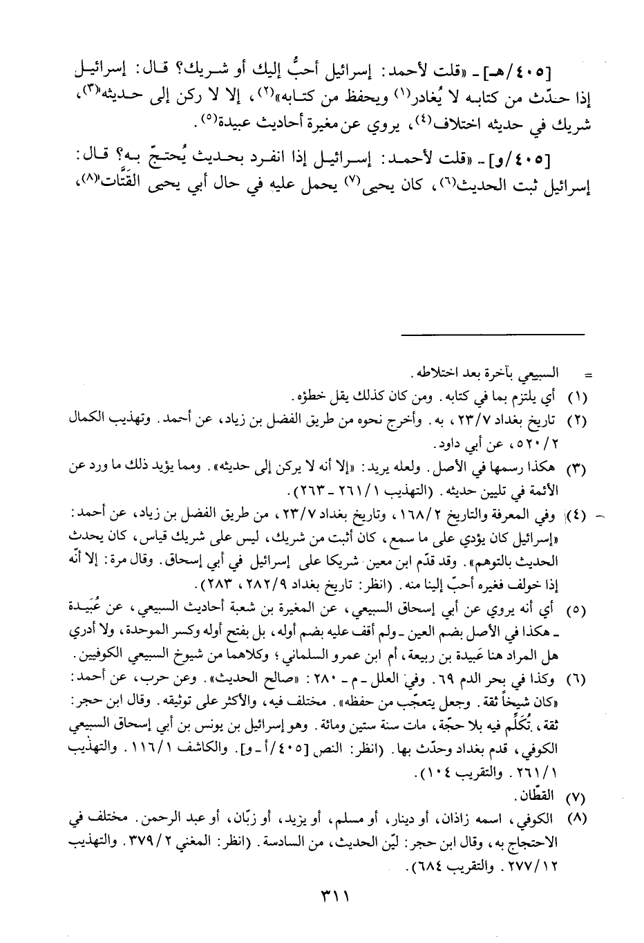 [405 هـ] قلت لِأَحْمَد إِسْرَائِيل أحب إِلَيْك أَو شريك قَالَ إِسْرَائِيل إِذا حدث من كِتَابه لَا يُغَادر ويحفظ من كِتَابه إِلَّا لَا ركن إِلَى حَدِيثه شريك فِي حَدِيثه اخْتِلَاف يروي عَن مُغيرَة أَحَادِيث عُبَيْدَة