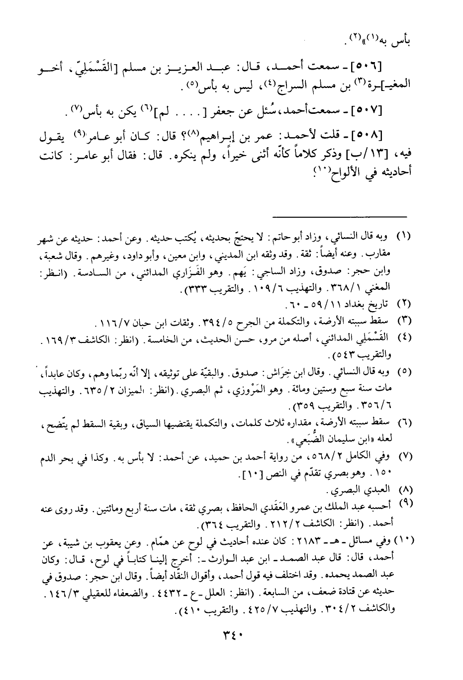 [506] سَمِعت أَحْمد قَالَ عبد الْعَزِيز بن مُسلم [الْقَسْمَلِي أَخُو المغي] رة بن مُسلم السراج لَيْسَ بِهِ بَأْس