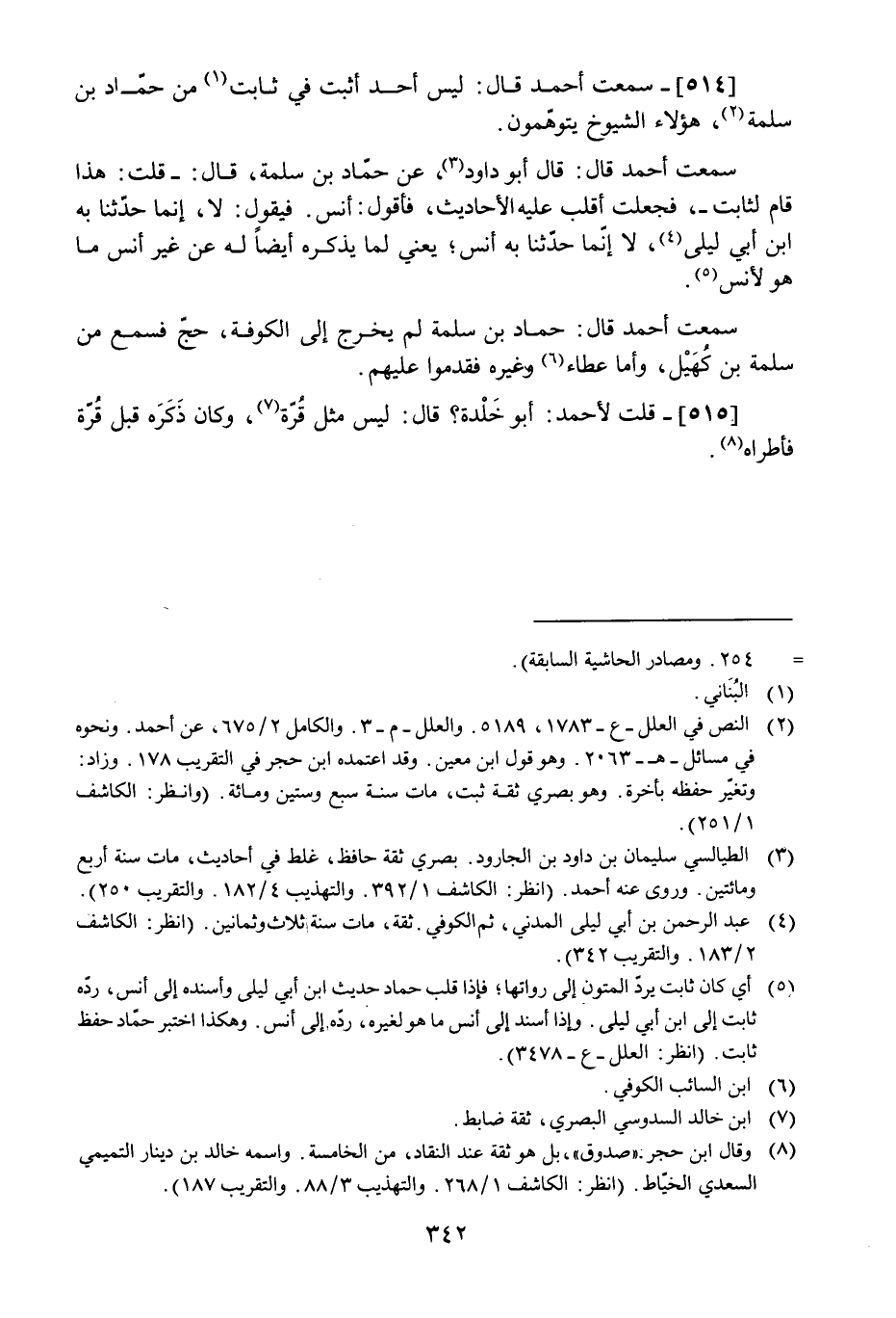 [514] سَمِعت أَحْمد قَالَ لَيْسَ أحد أثبت فِي ثَابت من حَمَّاد بن سَلمَة هَؤُلَاءِ الشُّيُوخ يتوهمون