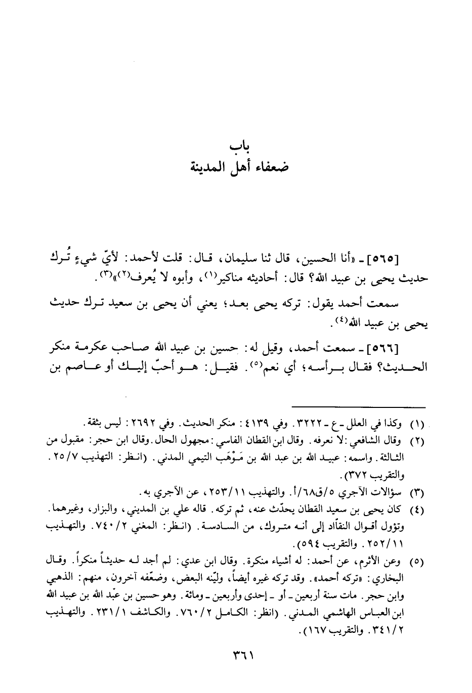 [565] أَنا الْحُسَيْن قَالَ ثَنَا سُلَيْمَان قَالَ قلت لِأَحْمَد لأي شَيْء ترك حَدِيث يحيى بن عبيد الله قَالَ أَحَادِيثه مَنَاكِير وَأَبوهُ لَا يعرف