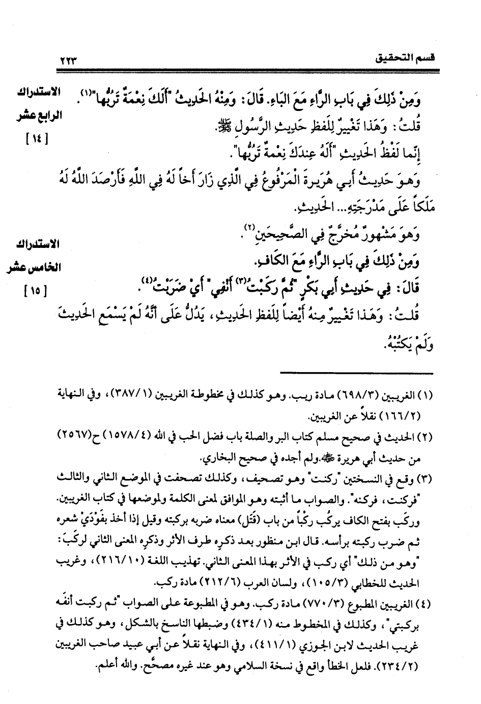 ومنْ ذلكَ في بابِ: الراءِ مع الباءِ، قال: ومنهُ الحديثُ ألكَ عليَّ نِعمَةٌ تَرَبُّها؟. قلتُ: وهذا تغييرٌ للفظِ حديثِ رسولِ الله صلى الله عليه وسلم. وإنَّما لفظُ الحديثِ: أَلَهُ عندكَ نعمةٌ تربّها؟. وهو حديثُ أبي هريرةَ المرفوع في الذي زارَ أخاً له في الله فأرْصَدَ الله ملكاً على مَدْرَجَتِه، الحديث، وهو مشهور مخرَّج في الصحيحين.