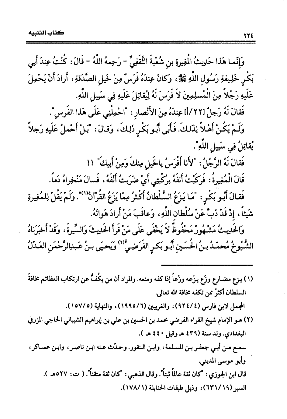 وإنّما هذا حديثُ المغيرةِ بنِ شُعبة الثقفي، رحمهُ الله، قال: كنتُ عندَ أبي بكرٍ خليفة رسولِ الله صلى الله عليه وسلم، وكانَ عندَه فرسٌ منْ خيلِ الصدقةِ أراد أنْ يحملَ عليهِ رجلاً منَ المسلمينَ ليقاتل عليه في سبيل الله، فقالَ لهُ رجلٌ عندَه من الأَنصارِ: احمِلْني على هذا الفرسِ - ولم يكن أهلاً لذلكَ. فأبى أبو بكرٍ ذلك وقال: