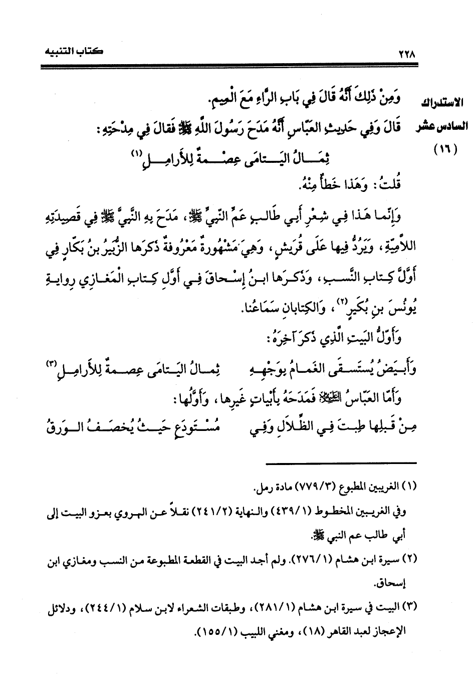 ومنْ ذلكَ أنَّه قالَ في بابِ: الراء مع الميم، قال: وفي حديث العبَّاس أنَّه مدحَ رسولَ الله صلى الله عليه وسلم فقال في مدحَتِه: (. . . . . . ثمالُ اليَتَامى عِصْمَةٌ للأَرامِل).