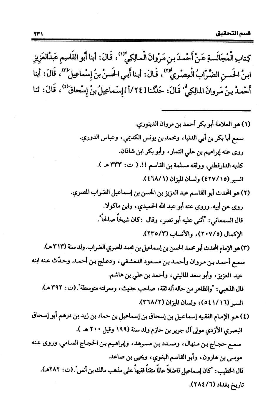 كتابِ المُجَالَسة عن أحمدَ بنِ مروانَ المالكيِّ، قال: أنبأَ أبو القاسمِ، عبدُ العزيزِ بن الحسنِ بنِ الضرّابِ المصريّ، قال: أنبأ أبو الحسن بن إسماعيل، قال: أنبأَ أحمدُ بن مروانَ قال: حدَّثنا إسماعيلُ ابنَ إسحق قال: ثنا