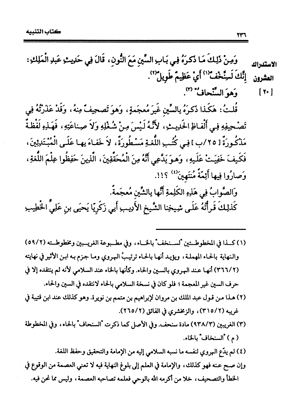 قلت: هكذا ذكره - بالسين المعجمة - وهو تصحيف منه. وقد عذرته في تصحيفه في ذلك ألفاظ الحديث، لأنه ليس من شغله ولا صناعته، وهذه لفظةٌ مذكورةٌ، في كتب اللغة مسطورة، لا خفاء بها على المبتدئين، فكيف خفيت عليه وهو يدّعي أنَّه من المحقّقين، الذين حفظوا علم اللغة وصاروا فيها أئمة منتهين؟.