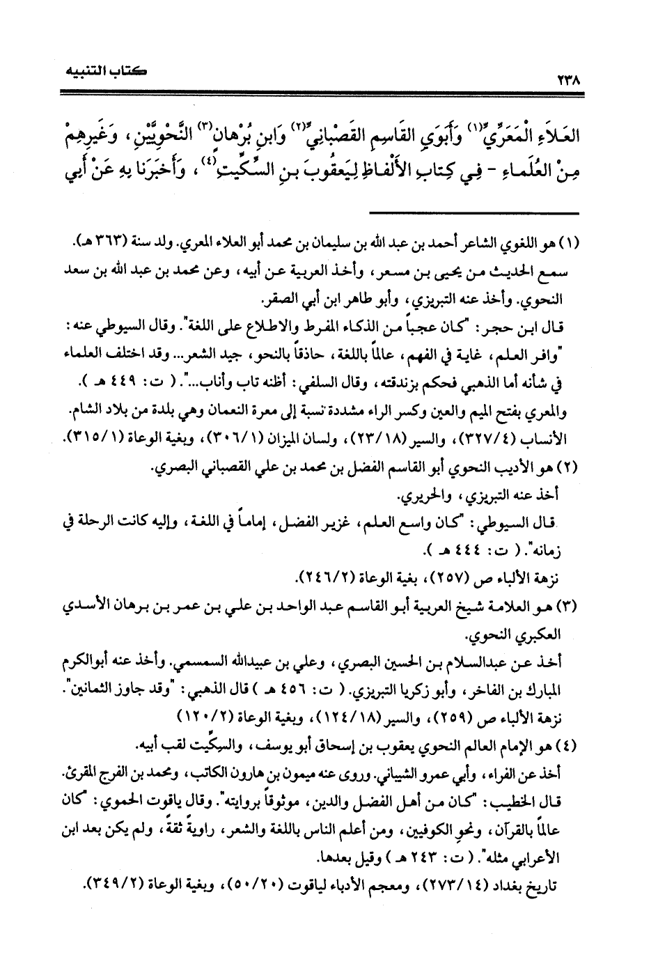 العلاء المعريّ، وأبي القاسم القصبانيّ، وابن برهان النحويين وغيرهم من العلماء في كتاب الألفاظ، ليعقوب بن السكّيت.