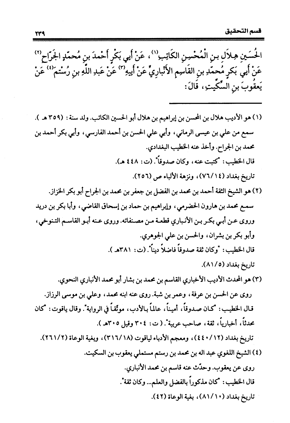 الحسين بن هلال بن المحسِّن الكاتبِ، عن أبي بكر أحمد بن محمدٍ الجرّاح، عن أبي بكر محمد بن القاسم الأنباريّ، عن أبيه عن عبد الله بن رستم، عن يعقوب بن السكّيتِ، قال: