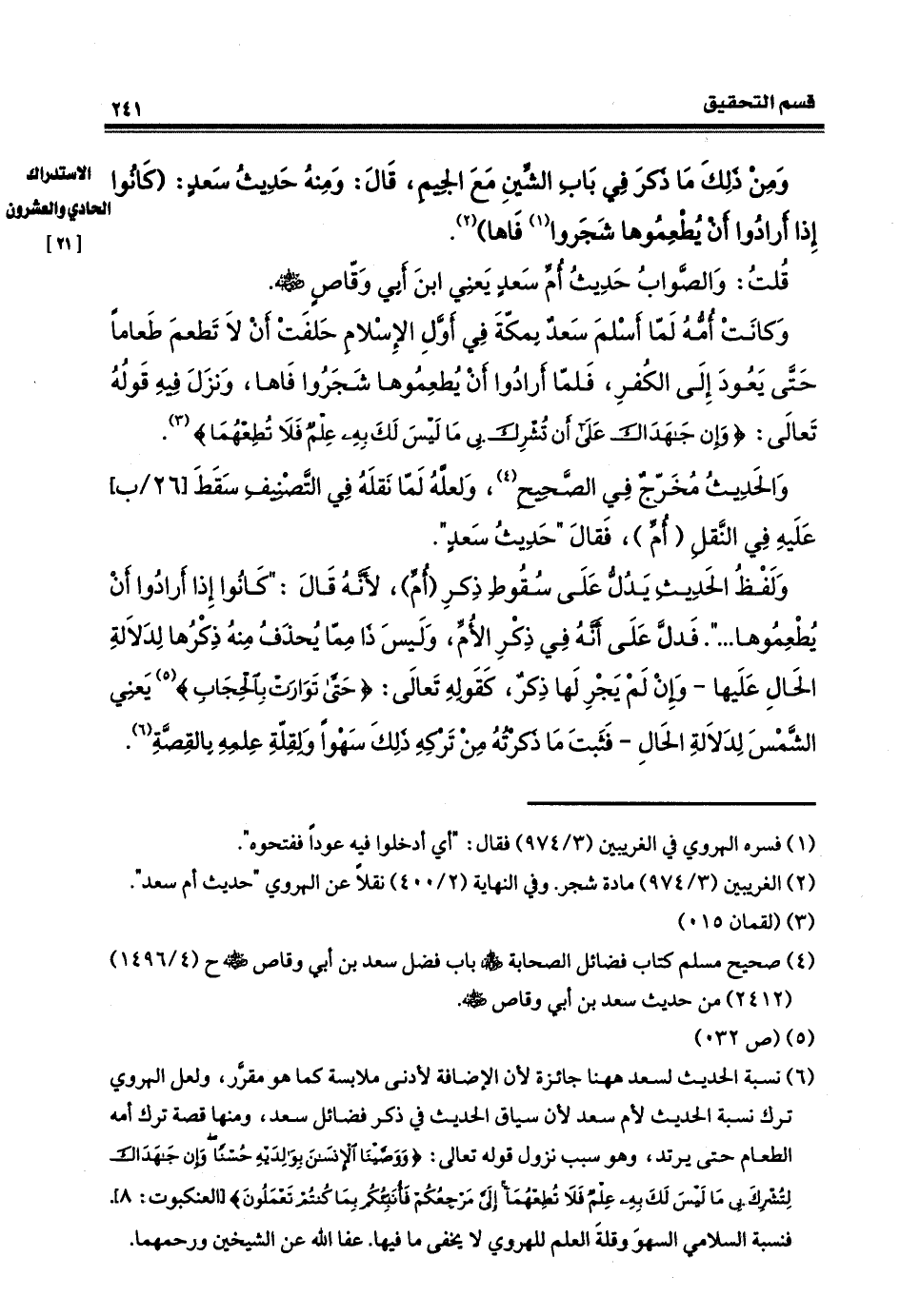 قلتُ: والصوابُ: حديثُ أمِّ سعدٍ، يعني ابنَ أبي وقّاص، رضي الله عنهُ وكانت أمه لمّا أسلم بمكّة في أوّل الإسلام حلفت ألاّ تطعم طعاماً حتّى يعود إلى الكفرِ، فلمّا أرادوا أن يطعِمُوها شَجَروا فاها، ونَزَلَ فيه قَوْلِه تعالى: (وإنْ جاهَدَاك على أنْ تُشْرِكَ بي ما ليسَ لكَ بهِ علمٌ فلا تُطِعْهُما)، والحديثُ مخرّجٌ في الصحيحِ. ولعلَّه لمّا نقلَهُ في التصنيفِ سَقَطَ عليه في النَّقلِ أمّ فقالَ: حديث سعدٍ، ولفظُ الحديثِ يدلّ على سقوطِ ذِكْرِ أمّ لأنه قال: إذا أرادوا أنْ يُطْعِموها، فدلّ على أنّه في ذكرِ الأمِ،