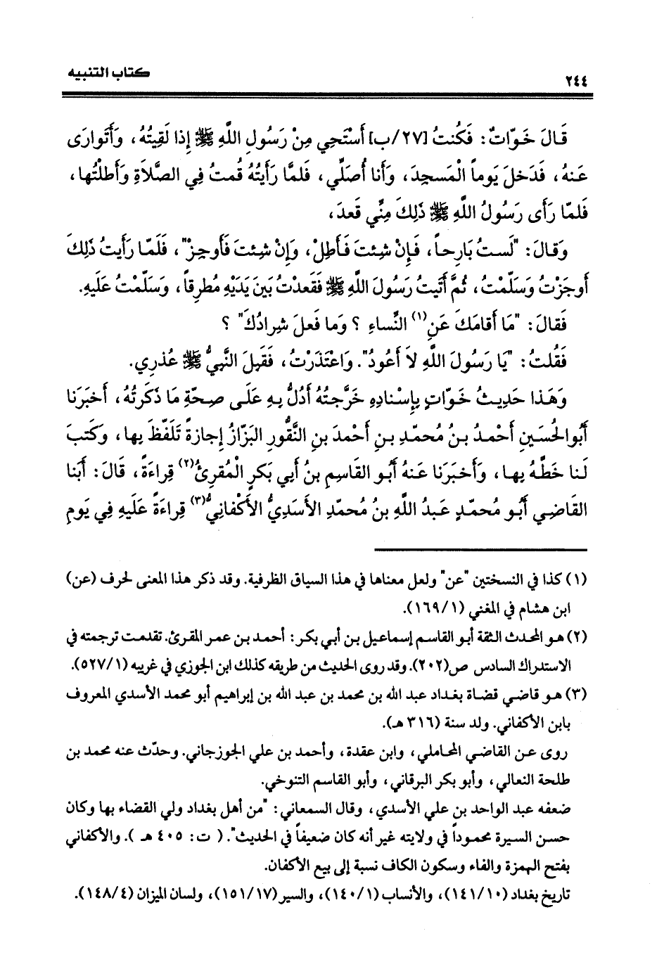 خوّات: فكنتُ أَسْتَحي منْ رسولِ الله صلى الله عليه وسلم، إذا لقيتُه وأتَوَارَى عنه. فدخَلَ يوماً المسجدَ وأنا أُصَلّي، فلمّا رأيتُه قمتُ في الصّلاة وأطلتُها، فلمّا رأى رسول الله صلى الله عليه وسلم، ذلك منّي قعد وقال: لستُ بارحاً فإنْ شئت فَأَطِل وإنْ شئتَ فَأَوْجِز فلمّا رَأَيت ذلك أَوْجَزْتُ وسلّمت، ثم أتيتُ رسولَ الله صلى الله عليه وسلم، فقعدتُ بينَ يديهِ مُطْرِقاً وسلَّمتُ عليه، فقالَ: ما أقامَكَ عنِ النِّساء؟ وما فعل شِرادُك؟. فقلتُ: يا رسولَ الله لا أعودُ واعتذرتُ. فقبلَ النبيُّ، صلى الله عليه وسلم عُذْري وهذا حديثُ خوّات بإسنادِه، خرّجته أدُلّ به على صحّةِ ما ذكرْتُه.