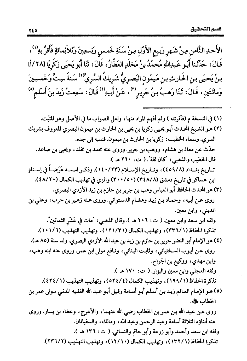 الأَحد الثامنَ عشرَ من شهرِ ربيعٍ الأوّل من سنةِ خمسٍ وتسعينَ وثلاثمئةٍ، فأقرَّبه، قال: حدّثنا أبو عبدِ الله محمَّد ابنِ مخلدٍ العطار، قال ثنا أبو يحيى زكريّا بن يحيىبنِ الحارثِ بنِ مَيْمون البصريّ، شريك السرّي سنة ستٍّ وخمسين ومئتين، قال: ثنا وهبُ بنُ جريرٍ عن أبيهِ قال: سمعتَ زيدَ بن أسلم