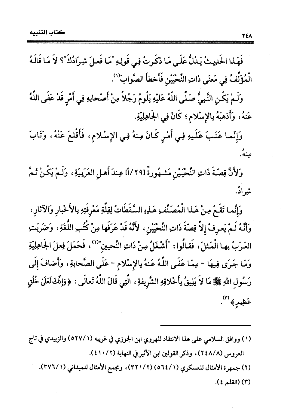 فهذا الحديث يدلّ على ما ذكرتُ في قوله: ما فعلَ شرادُكَ؟، لا ما قالَه المؤلفُ في معنى ذاتِ النّحْيَيْن فأَخْطَأَ الصواب. ولم يكن النبيّ، صلى الله عليه وسلم يلومُ رجلاً من أصحابِه في أمرٍ قدْ عفا الله عنه، وأذهبَهُ بالإسلامِ، كانَ في الجاهليّة. وإنّما عَتَبَ عليه في أمرٍ كانَ منهُ في الإسلام أقلع عنه، وتاب منه، ولأنّ قصَّةَ ذات النّحيين مشهورة عند أهل العربية، ولم يكن ثمّ شرادٌ. وإنّما تقعُ منْ هذا المصنِّف هذه السَّقطات لقلّة معرفته بالأخبارِ والآثارِ، وأنّه لمْ يعرِف إلاّ قصةَ ذاتِ النّحيين لأنّه قد عَرَفها من كتبِ اللغةِ، وضربتِ العربُ به المثل، فقالوا: أشْغَلُ مِنْ ذَاتِ النِّحْيَيْنِ فَحَمَلَ فعلَ الجاهلية وما جرى فيها ممّا عفا الله عنه بالإسلامِ على الصّحابة، وأضافَ إلى رسولِ الله، صلى الله عليه وسلم، ما لا يليقُ بأخلاقهِ الشريفةِ، التي قال الله تعالى: (وإنَّكَ لَعَلَى خُلُقٍ عظيمٍ).