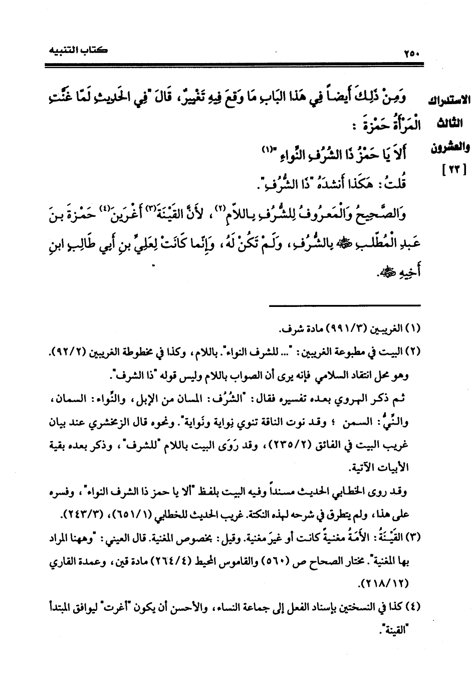قلت: هكذا أنشده: ذا الشُّرفِ، والصحيحُ والمعروف للشُّرفِ، باللام لأنّ القَيْنَة أَغْرَيْن حمزةَ بنَ عبدِ المطلب، رضي الله عنه بالشُّرفِ ولم تكنْ له، وإنّما كانت لعليّ ابن أبي طالب، ابن أخيه، رضي الله عنه،