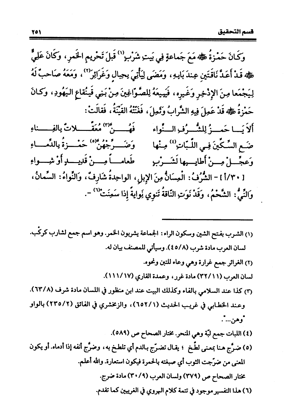 وكان حمزة، رضي الله عنه مع جماعةٍ في بيتِ شربٍ قبل تحريمِ الخمرِ، وكانَ عليٌّ، رضيَ الله عنه قدْ أعدّ ناقَتَيْن عندَ بابِه، ومضى ليأتي بحبالٍ وغرائر ومعهُ صاحبٌ له ليجمعا من الإذْخِرِ وغيِره فيبيعه للصواغينَ منْ بني قَيْنُقَاع اليهود وكان حمزةُ، رضيَ الله عنه قد عَمِلَ فيه الشرابُ وثمل فغنّته القينة فقالت: