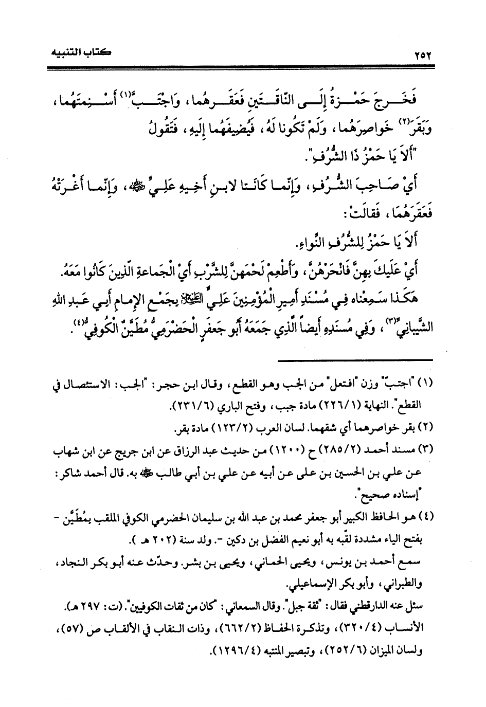 فخرج حمزة إلى الناقتين فعقرهما واجتبَّ أسْنِمتهما، وبَقَر خواصرهما، ولم تكونا له فتضيفهما إليه، فتقول ألا يا حمزَ ذا الشُّرفِ. أي: صاحب، وإنّما كانتا لابن أخيه عليٍّ، رضي الله عنه. وإنّما أغرتهُ فعقرهما فقالتْ: