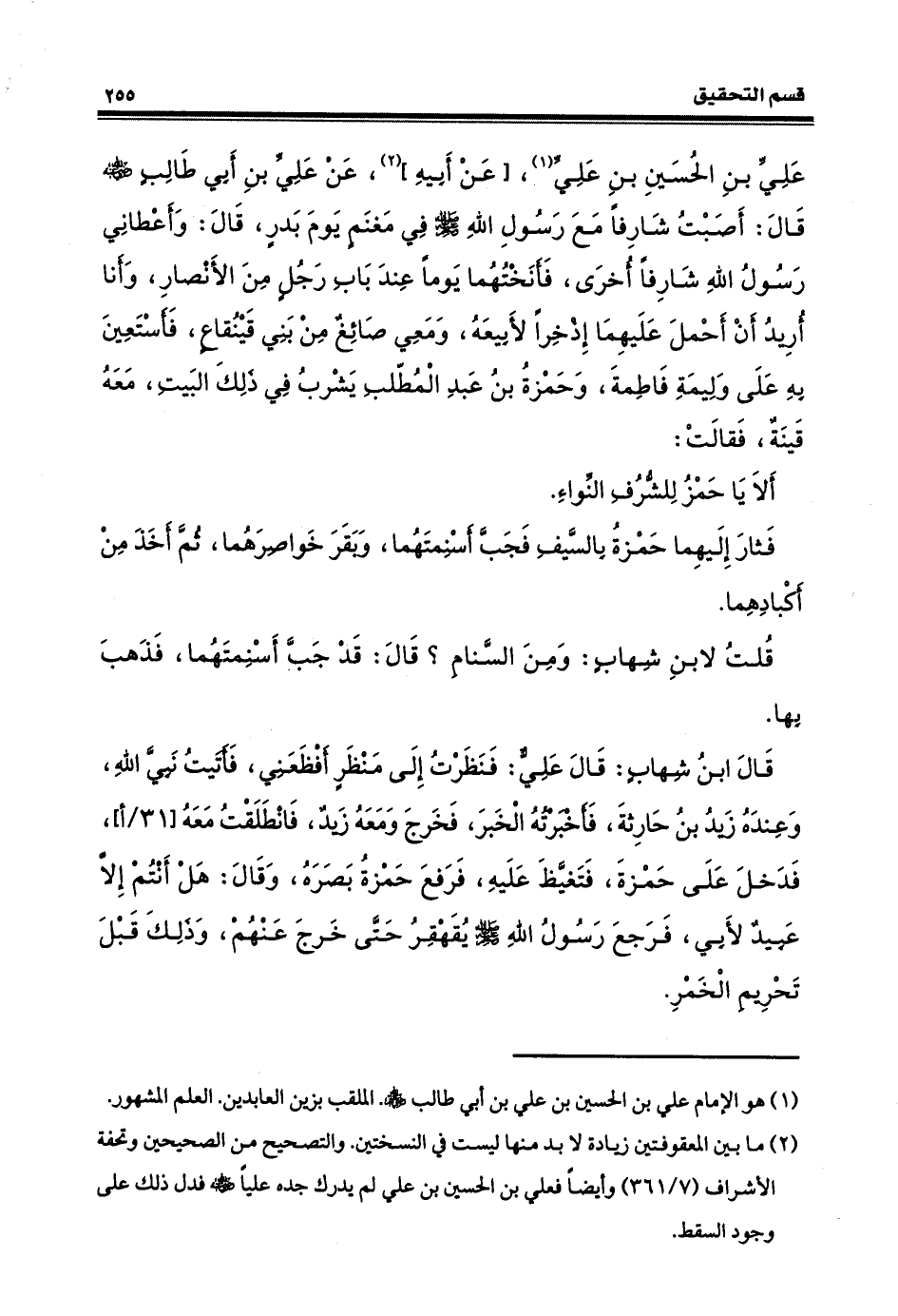 عليٍّ ابنِ حُسَين بنِ عليٍّ عن عليِّ بنِ أبي طالبٍ، رضيَ الله عنه، قالَ: أَصَبْتُ شارِفاً معَ رسولِ الله، صلى الله عليه وسلم، في مَغْنَمِ يومِ بَدْرٍ قالَ: وأَعْطَاني رسولُ الله شارِفاً أخرى، فأنَخْتُهما يوماً عندَ باب رجلٍ من الأَنْصارِ، وأنا أريدُ أنْ أحملَ عليهِما إِذْخِراً لأبيعهُ ومعي صائغٌ منْ بَني قَينُقاع فأَسْتَعين به على وليمةِ فاطمةَ، وحمزةُ بنُ عبدِ المطلب يشربُ في ذلكَ البيتِ مَعَه قينةُ تغنيه فقالتْ:
