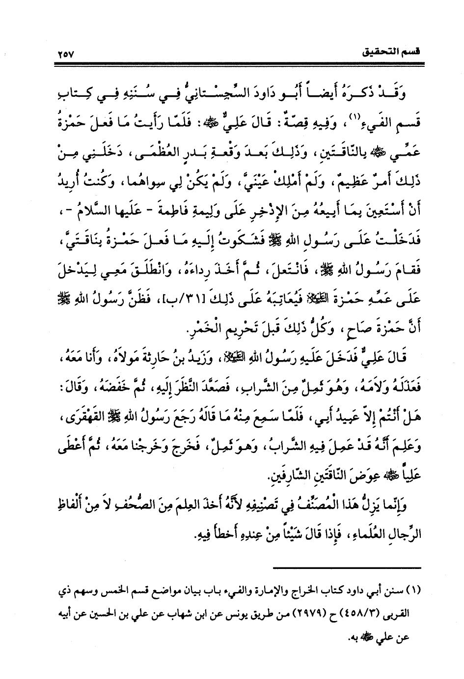 قالَ عليٌّ رضي الله عنهُ: فلمّا رأيتُ ما فعلَ حمزةُ عَمِّي، رضي الله عنهُ، بالناقتين وذلك بعدَ مَوْقِعَةِ بدر العُظْمَى دَخَلَني من ذلك أمرٌ عظيمٌ ولم أَمْلِك عينيّ، ولم يكنْ لي سواهما وكنتُ أريدُ أن أستعينَ بما أبيعُه منَ الإذْخِر على وليمةِ فاطمةَ عليها السلام. فدخلت على رسول الله، صلى الله عليه وسلم، فشكوت إليه ما فعل حمزة بناقتيّ، فقامَ رسولُ الله، صلى الله عليه وسلم، فانْتَعل، ثم أخَذ رداءَه وانطلقَ معي ليدخُلَ على عمّه حمزة، عليه السلام فيعاتبه على ذلك فظنّ رسول الله صلى الله عليه وسلم أنَّ حمزة صاحٍ. وكلّ ذلك قبلَ تحريمِ الخمرِ، قالَ عليٌّ: فدخلَ عليه رسولُ الله، عليه السَّلامُ وزيد بنُ حارثةَ مولاهُ وأنا معهُ، فعَذَلَهُ ولامَهُ وهو ثَمِلٌ منَ الشَّرابِ، فصعَّد النظرَ إليهِ ثم خَفَضَهُ، وقالَ: هل أنتم إلا عبيدُ أبي؟ فلمّا سَمِعَ منه ما قالَهُ رَجَعَ رسولُ الله صلى الله عليه وسلم القَهْقَرى وعَلِمَ أنَّه قد عَمِلَ فيه الشرابُ وهو ثَمِلٌ. فخَرَجَ وخَرَجْنا مَعَه ثم أَعْطَى عَليَّاً رضي الله عنهُ عوضَ النَّاقتين الشّارفَيْن. وإنّما بدَّل هذا المصنّفُ في تصنيفِه لأنّه أَخَذَ العلمَ من الصُّحفِ، لا منْ ألفاظِ الرجالِ العلماءِ، فإذا قالَ شيئاً منْ عندِه أَخْطَأ فيه.