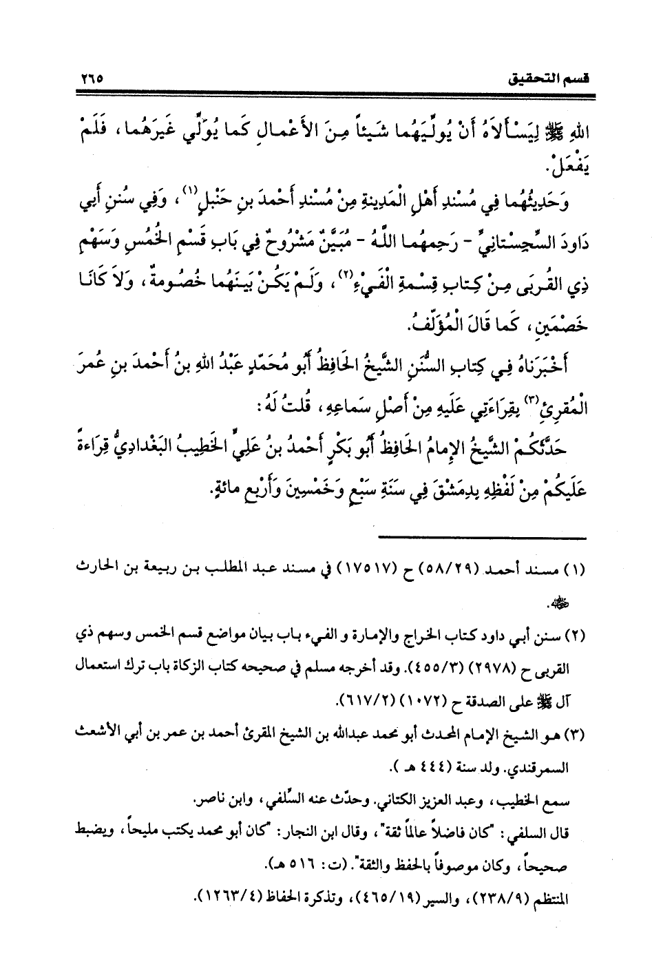 غيرَهما فَلَم يَفْعَل. وحديثُهما مسندُ أهلِ المدينةِ منْ مسندِ أحمدِ بنِ حنبلٍ، وفي سننِ أبي داودَ السّجِستانيّ رحِمَهما الله - مبيّنٌ مشروحٌ في بابِ قِسْمَة الخِمْس وسهمِ ذوي القربى من كتابِ قِسْمَةِ الفيء، ولم يكنْ بينَهما خصومة ولا كانا خَصْمَيْن كما قالَ المؤَلِّفُ.
