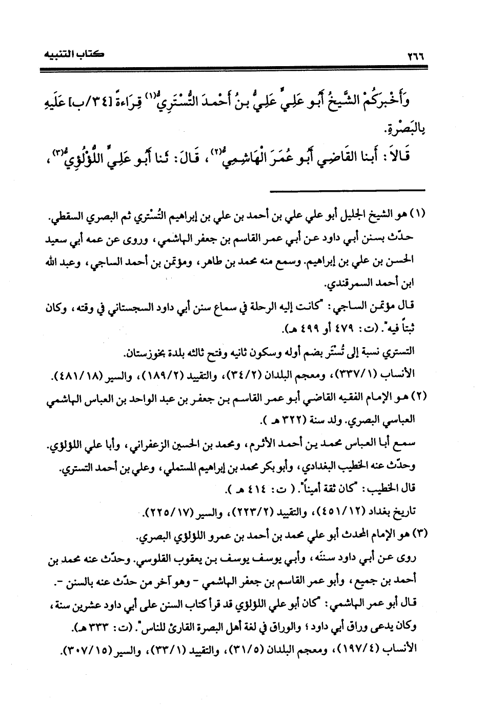 وأخبركم الشيخ أبو عليٍّ بن أحمد التّستريّ قراءة عليه بالبصرةِ، قالَ: أنبأَ القاضي أبو عمرٍ الهاشميِّ، قالَ: ثنا أبو علي اللؤلؤيّ،