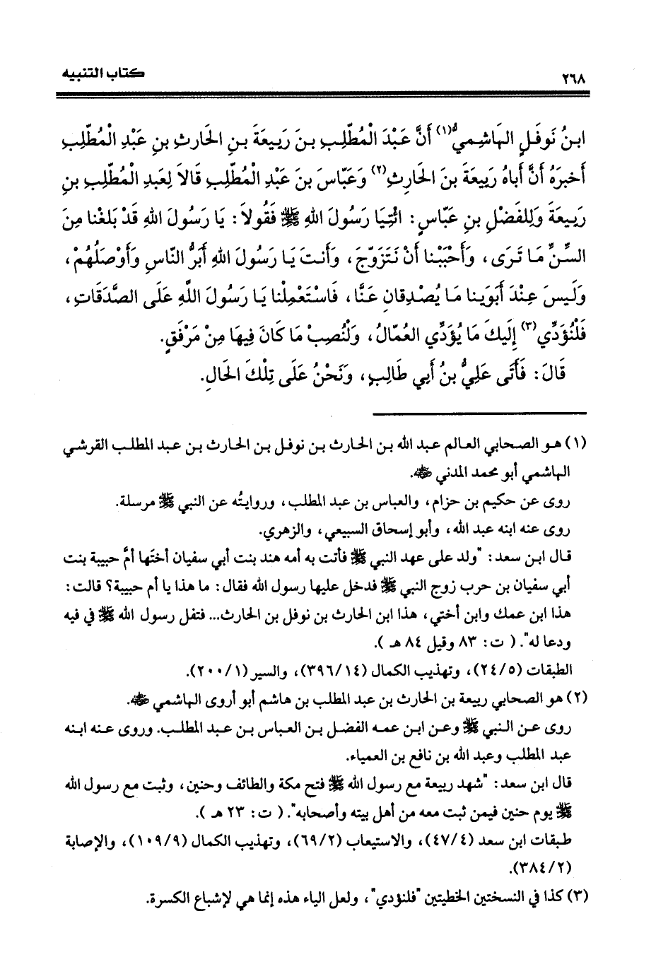 بنِ نوفَلٍ الهاشميّ أنَّ عبدَ المطلبِ بن ربيعةَ بنَ الحارثِ أخبَرُه أنّ أباه ربيعةَ ابنَ الحارِثِ وعبّاسَ بنَ عبدِ المطّلبِ قالا لعبدِ المطّلبِ بنِ ربيعةَ والفضلِ بنِ عباسِ: ائتيا رسولَ الله، صلى الله عليه وسلم فقولا له: يارسولَ الله، قد بَلَغْنا منَ السنِّ ما تَرَى، وأحببْنَا أنْ نتزوّجَ، وأنتَ رسولُ الله أبرُّ الناسِ وأْوصلُهم، وليسَ عندَ أَبَوَيْنا ما يَصْدُقانِ عنَّا فاستعملْنا يا رسولَ الله على الصَّدقاتِ، فلنؤدِّ إليكَ ما يؤدّي العمّال، ولنصبْ ما كانَ فيها منْ مرفَقْ. قال: فأتَى عليّ بنُ أبي طالبٍ ونحن على تلكَ الحالِ