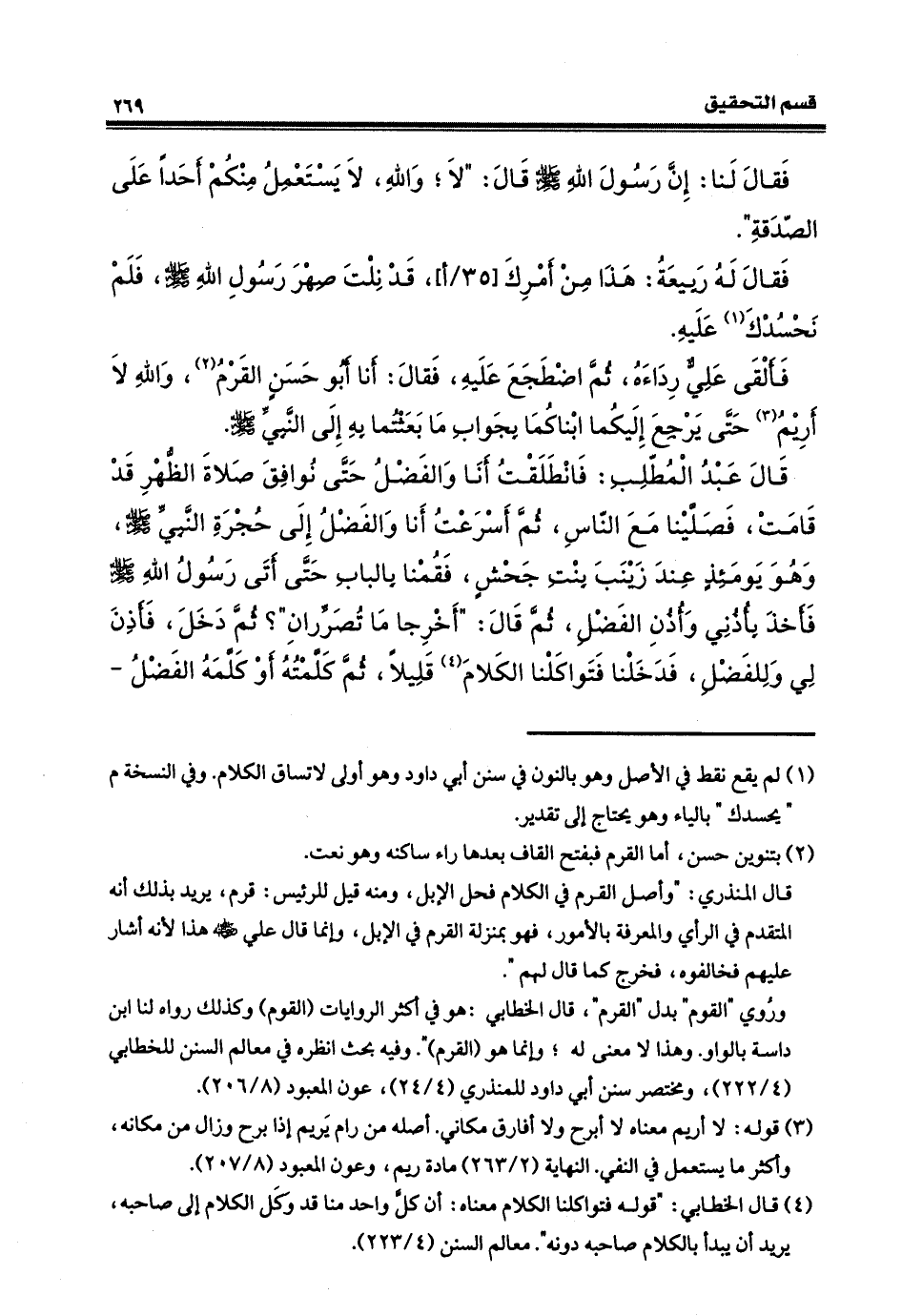 فقالَ لَنَا: إنّ رسولَ الله صلى الله عليه وسلم، قالَ: لا والله لا نستَعْمِلُ أحداً منْكُم. على الصدقة فقالَ لهُ ربيعةُ: هذا منْ أَمْرِك، قدْ نلت صهرَ رسولِ الله، صلى الله عليه وسلم، فلمْ نَحْسُدكَ عليه، فأَلْقَى عليٌّ رداءَه ثم اضْطَجَعَ عليه فقالَ: ثنا أبو حسن القَرْمُ، والله لا أَريمُ حتى يرجعَ إليكُمَا ابناكُما بجوابِ ما بعثتما بهِ إلى النبيّ، صلى الله عليه وسلم. قال عبدُ المطّلب: فانطلقْتُ أنا والفضلُ حتىّ نوافقَ صلاةَ الظُّهرِ قدْ