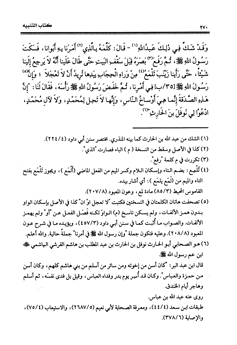وقد شكّ في ذلكَ عبدُ الله، قالَ: كلَّمه الذي أمرنا به أبونا فسكت رسولُ اللهِ، صلى الله عليه وسلم، ثم رفعَ بصَرَهُ قِبَلَ سقفِ البيتِ حتّى طالَ علينا أنّه لا يرجعُ إلينا شيئاً، حتى رأيْنَا زينبَ تلمعُ من وراءِ الحجابِ بيدِها، تريدُ ألاّ تعجل، أو أنَّ رسول الله، صلى الله عليه وسلم في أمرِنا، ثم خفضَ رسولُ الله صلى الله عليه وسلم رأسَهُ فقالَ لنا: إنَّ هذهِ الصدقةُ إنّما هي أوْساخُ الناسِ، وإنّها لا تَحِلّ لمحمّدٍ، ادعو لي نوفلَ بنَ الحارثِ،