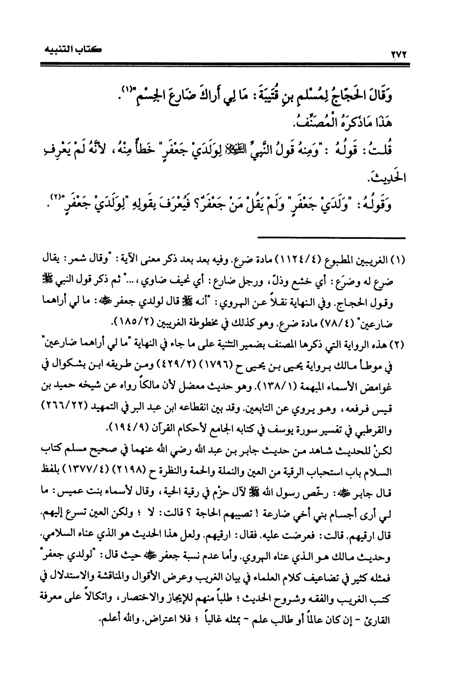 وقال الحجاج لمسلمِ بنِ قتيبةَ: مالي أراكَ ضارعَ الجسمِ؟، هذا ما ذكره المصنِّفُ. قلت: قوله: ومنْهُ قولُ النبيِّ، عليهِ السلامُ لولدَيْ جعفرِ، خطأ منهُ لأنّهُ لم يعرف الحديثَ. وقوله: ولدَيْ جعفَرِ ولم يقل: من جَعْفَرُ فيعرف بقوله: