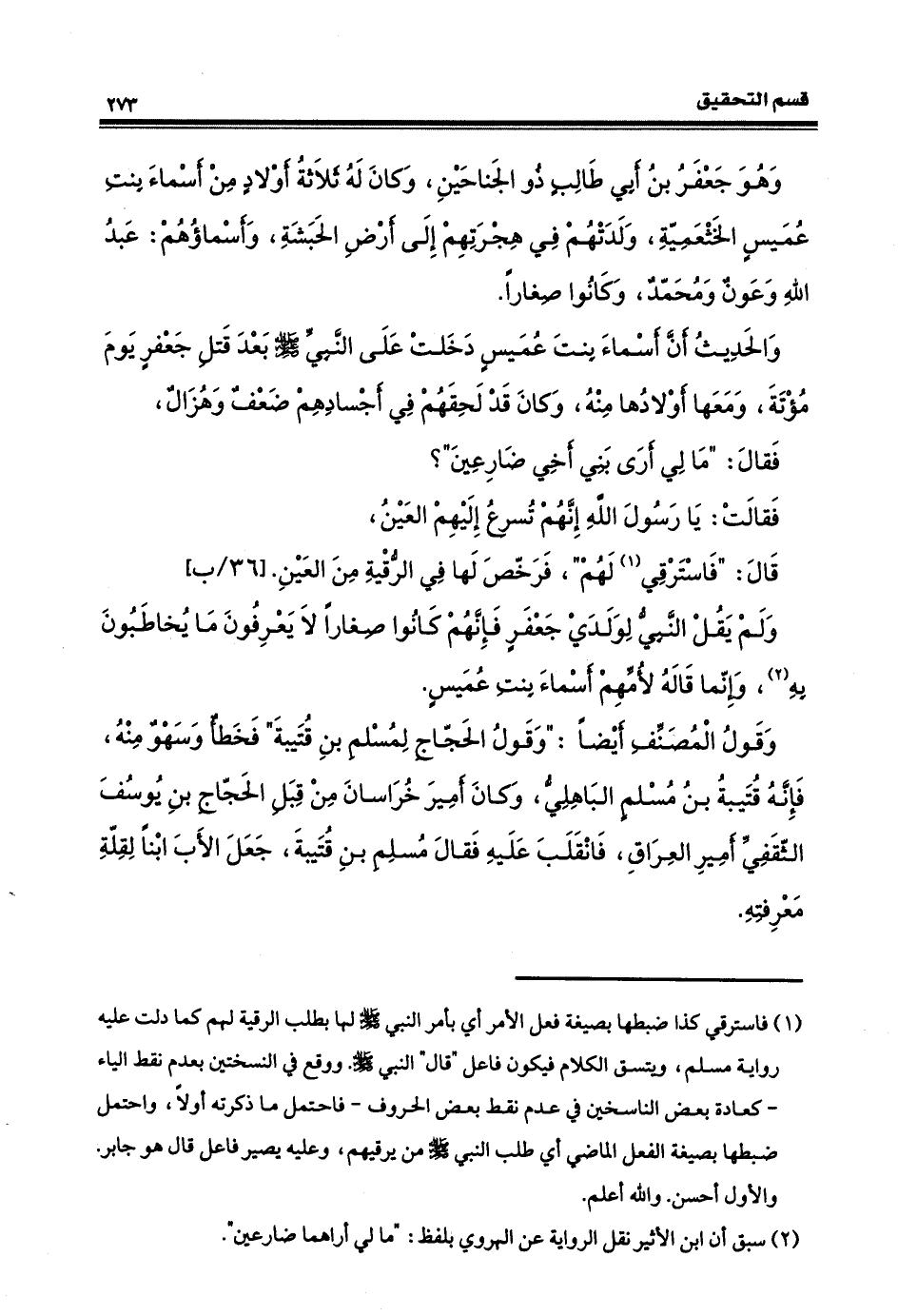 وهو جعفر بن أبي طالبٍ، ذو الجناحينِ. وكان له ثلاثةُ أولادٍ من أسماءَ بنتِ عُمَيْسٍ الخَثْعميَّةِ ولدتْهُمْ في هجرتهم إلى أرضِ الحبشةِ. وأسماؤهم: عبد الله، وعَوْنُ، ومحمدٌ وكانوا صغاراً. والحديث أنَّ أسماء بنتَ عُمَيْسٍ دخلتْ على النبيِّ صلى الله عليه وسلم بعد قتل جعفر يومَ مؤتةَ ومعها أولادها منه، وكان قد لحقهم في أجسادِهِم ضعفٌ وهزالٌ فقال: مالي أرى بني أخي ضارِعَين؟ فقالتْ: يا رسولَ اللهِ، إنهم تُسْرع إليهِم العينُ ولم يقل النبيِّ لولدَي جعفرٍ، فإنهمْ كانوا صِغاراً لا يَعْرِفونَ ما يُخاطَبونَ بِهِ، وإنما قاله لأمهم أسماءَ بنتِ عُمَيْسٍ. وقول المصنِّف أيضاً: وقولُ الحجّاجِ لمسِلمِ بنِ قتيبةَ، فخطأ وسهوٌ مِنْهُ، فإنه قتيبةُ بنُ مسلمٍ الباهليّ، وكان أميرَ خراسانَ من قبل الحجّاجِ بنِ يوسفَ الثقفيِّ أمير العراقِ، فانقلب عليهِ فقالَ: مسلم بنُ قتيبةَ، فجعلَ الأبَ ابناً لقلةِ معرفتِهِ.
