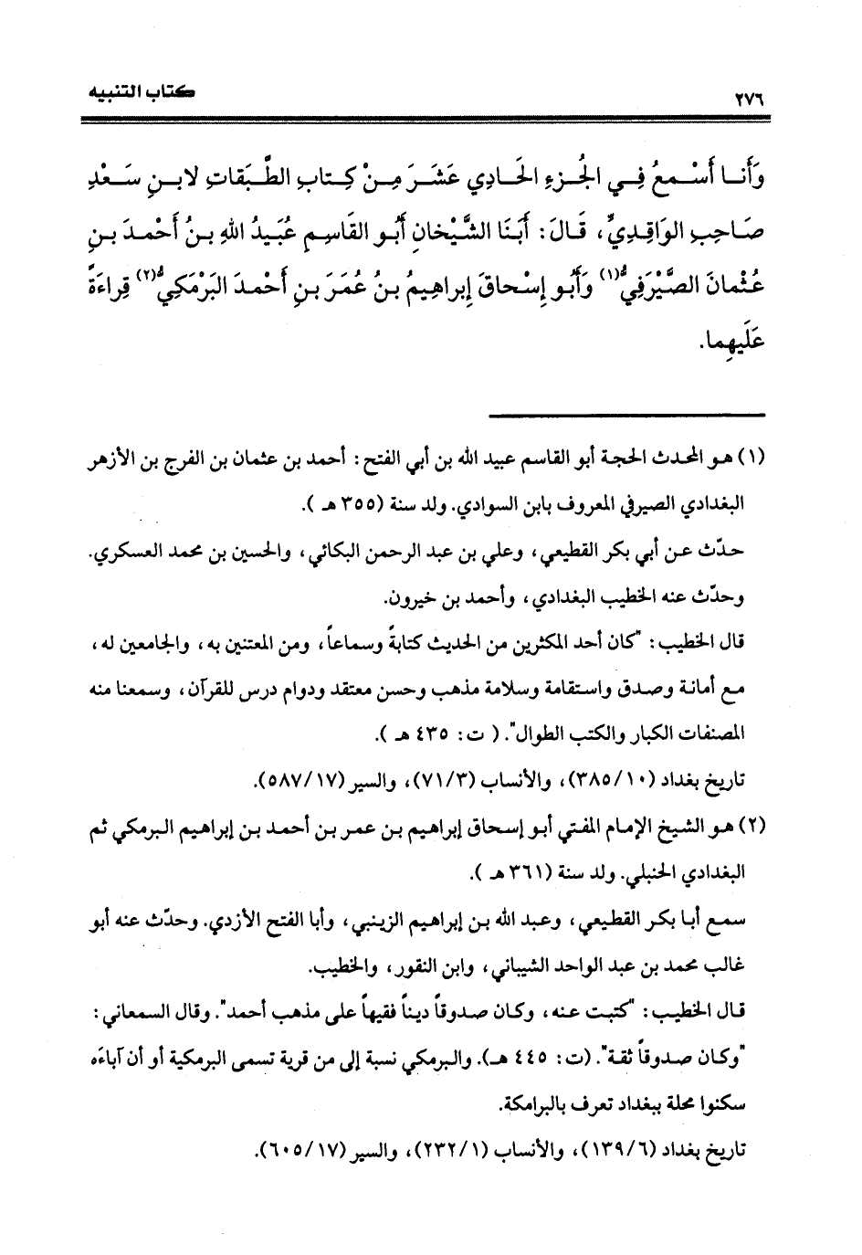 وأنا أسمع في الجزء الحادي عشر من كتاب الطبقات لابن سعد صاحب الواقدي، قال: أنبأ الشيخان أبو القاسم، عبيد الله بن أحمد بن عثمان الصّيرفيّ، وأبو إسحق إبراهيم بن عمر ابن أحمد البرمكيّ، قراءة عليه