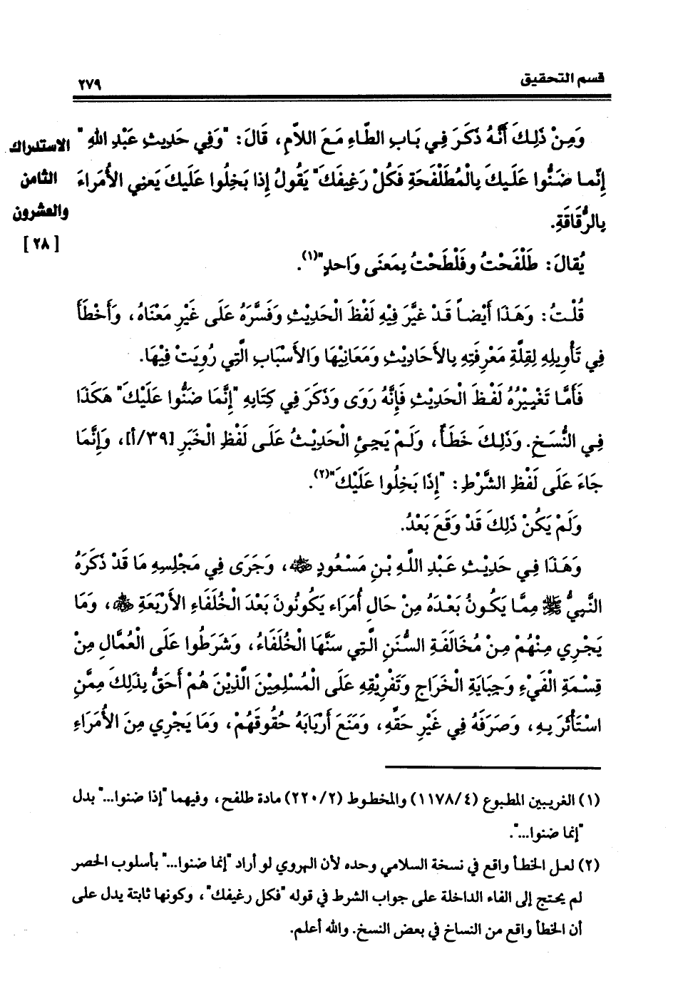 قلت: وهذا أيضاً قد غيَّر فيه لفظ الحديث، وفسَّره على غير معناه، وأخطأ في تأويله لقلّة معرفتهِ بالأحاديث ومعانيها، والأسباب التي رويت فيها. فأمّا تغيير لفظ الحديثِ، فإنَّه روى وذكر في كتابه: إنّما ضَنُّوا عليكَ، هكذا في النُّسخ وذلك خطأ، ولم يجئِ الحديثُ على لفظِ الخبرِ وإنَّما جاءَ على لفظِ الشرطِ: إذا بخلوا عليك ولم يكن ذلك قدْ وقع بعد. وهذا في حديث عبد الله بن مسعودٍ، رضي الله عنهُ، وجرى في مجلسه ما قد ذكره النبيُّ، صلى الله عليه وسلم، مما يكون بعده من حال أمراء يكونونَ بعدَ الخلفاءِ، وشرطوا على العمَّال من قسمة الفيء وجباية الخراج، وتفريقه على المسلمين الذينَ هم أحقُّ بذلك ممَّن أستأثر به وصرفه في غير حقِّه، ومنع أربابه حقوقهم، وما يجري من الأمراء