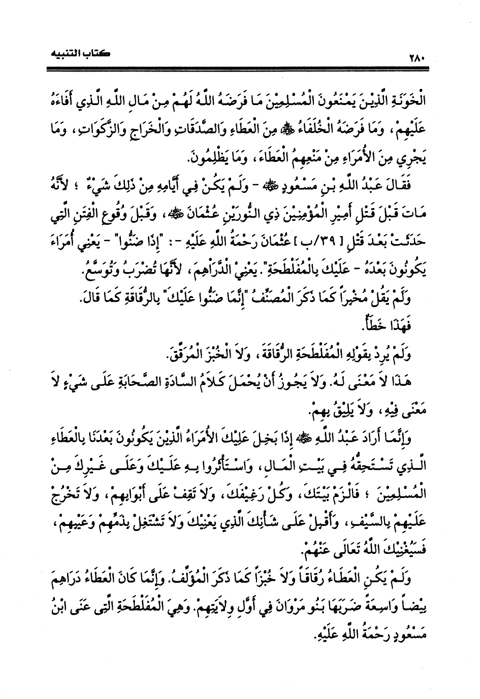 فرضه الله عليهم، وما فرضه الخلفاء رضي الله عنهم من العطاءِ والصّدقاتِ والخراج والزكاةِ، وما يجري من الأمراء من منعْهم العطاءَ وما يظلمون. فقال عبد الله بنُ مسعودٍ، رضي الله عنه، ولم يكن أيّامه من ذلك شيءٌ، لأنّهُ مات قبل أمير المؤمنين، ذي النورين، عثمان رضي الله عنه، وقبل وقوع الفتن التي حدثتْ بعد قتلِ عثمان، رحمه الله،: إذا ضنّوا يعني: أمراء بعده عليك بالمفلطحة، يعني: الدراهم، لأنها تُضرب وتوسَّع ولم يقل مخبراً كما ذكر المصنِّف: إنّما ضنّوا عليك بالرقاقة، كما قال: ولم يرد بقوله: المفلطحة الرقاقة ولا الخبز المرقّق، هذا لا معنى له، ولا يجوز أن يحمل كلام السادة الصحابة على شيء لا معنى فيه ولا يليق بهم، وإنّما أراد عبد الله، رضي الله عنه، إذا بخل عليك الأمراء الذين يكونون بعدنا بالعطاء الذي تستحقُّه في بيت المال، واستأثروا به عليك وعلى غيركَ من المسلمين فالزم بيتكَ، وكُلْ رغيفك، ولا تقفْ على أبوابهم، ولا تخرج عليهم بالسيفِ، وأقبل على شأنكَ الذي يعنيك، ولا تشتغل بذمِّهم، فسيغنيك الله تعالى عنهم. ولم يكنِ العطاء رقاقاً ولا خبزاً كما ذكر المؤلف، وإنّما كان العطاء دراهم بيضا واسعة يضربها بنو مروان في أوّلِ ولايتهم، وهي المفلطحة التي عنى ابن مسعودٍ، رحمة الله عليهِ.