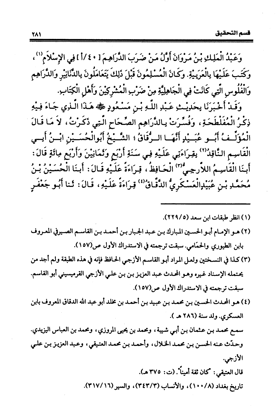 وقد أخبرنا بحديث عبد الله بن مسعودٍ، رضي الله عنه، هذا الذي جاء فيه ذكر المفَلْطَحَة وفسِّرت بالدراهم الصِّحاح التي ذكرت، لا ما قال المؤلف أبو عبيد: إنها الرُّقاق. الشيخ أبو الحسين بن أبي القاسم الناقدُ، بقراءتي عليه في سنة أربعٍ وثمانين وأربعمئةٍ، قال: أنبأ القاسم الّلارجي الحافظ، قراءة عليه قال: أنبأ الحسين