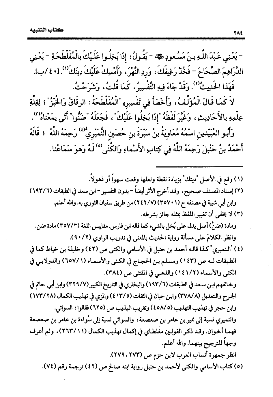 يعني عبد الله بن مسعودٍ، رضي الله عنه يقول: إذا بخلوا عليك بالمفَلْطَحة يعني الدراهم الصحاح: كل رغيفك، وردِ النّهرَ، وأمسك عليك دينَك. فهذا الحديث، وقد جاء فيه التفسير كما قلت وشرحت لا كما قال المؤلف وأخطأ في تفسير المفَلْطَحة: الرّقاق والخبز، لقلّة علمه بالأحاديث، وغيّر لفظه: إذا بخلوا، فجعلها ضنّوا أتى بمعناه. وأبو العبيدين: اسمه معاوية بن سَبْرة بن حصين النميري، رحمه الله، قاله ابن حنبل، رحمه الله، في كتاب الأسماء والكنى، وهو سماعُنا.